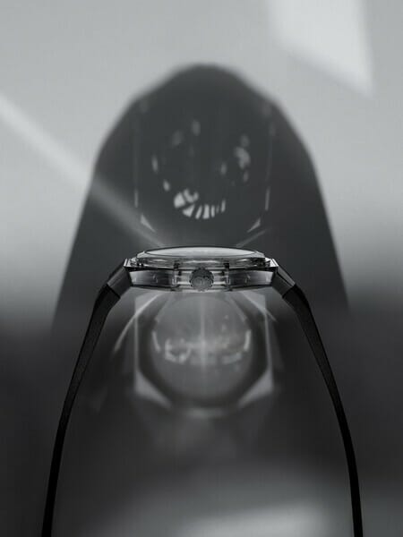 Girard-Perregaux a le plaisir à présent de dévoiler la nouvelle Laureato Absolute Light & Shade, un modèle qui capitalise le savoir-faire horloger engrangé par la Maison et bénéficie de sa vaste expertise en matière de matériaux innovants. D’un diamètre de 44 mm, le boîtier en verre saphir métallisé octroie à la nouvelle Laureato une brillance fascinante. Le garde-temps affiche une apparente légèreté et invoque la transparence, tout en paraissant a contrario sombre et sibyllin. Cette légèreté visuelle est étayée par son faible poids de 85 grammes seulement. Dans toute sa composition, le garde-temps ne cesse de réunir les contrastes – ce qui rend totalement unique cette expression contemporaine de Haute Horlogerie.