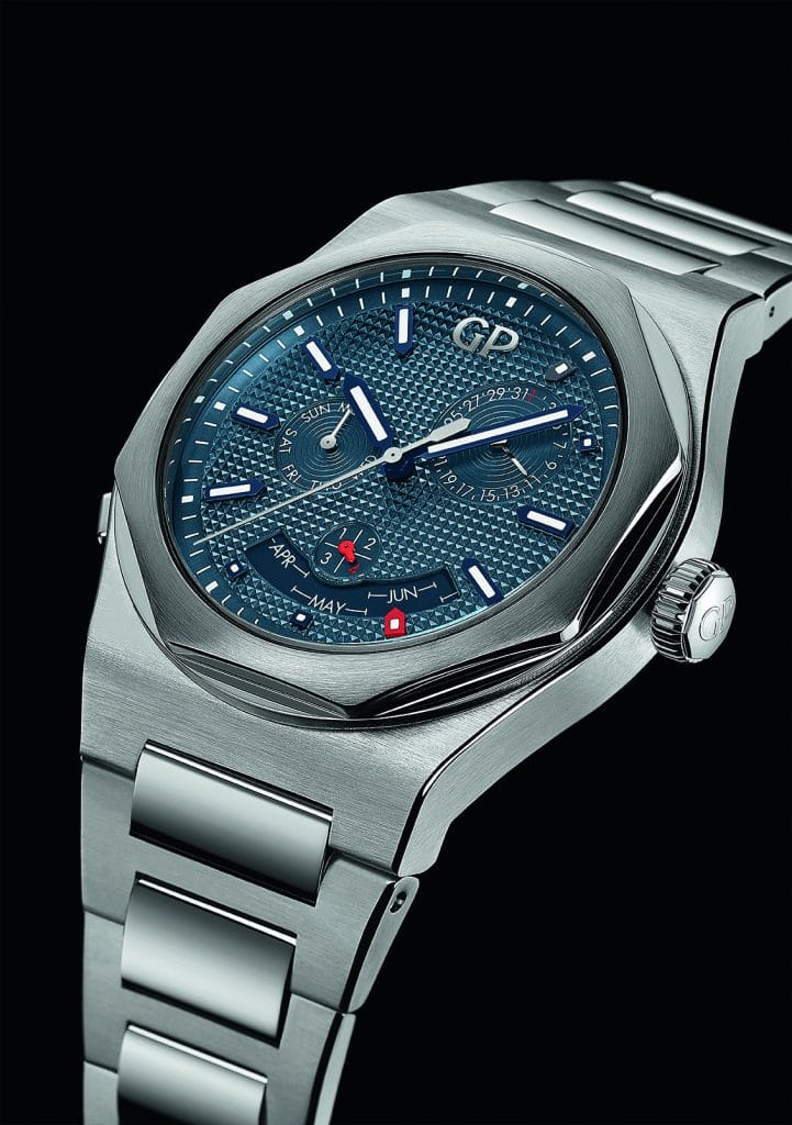 Elle est taillée dans un bloc d’acier de 42 mm de diamètre, alternativement poli et satiné avec le soin qui caractérise la Manufacture Girard-Perregaux. Elle se fixe autour du poignet par un bracelet de même nature, de même finition, de même qualité. Dans cette configuration proprement unique, tout acier et asymétrique, la Laureato Perpetual Calendar affirme son statut de montre à la présence forte, architecturale. Son cadran clous de Paris bleu, sur lequel contrastent nettement des indications blanches, achève de l’inscrire dans la modernité la plus absolue.