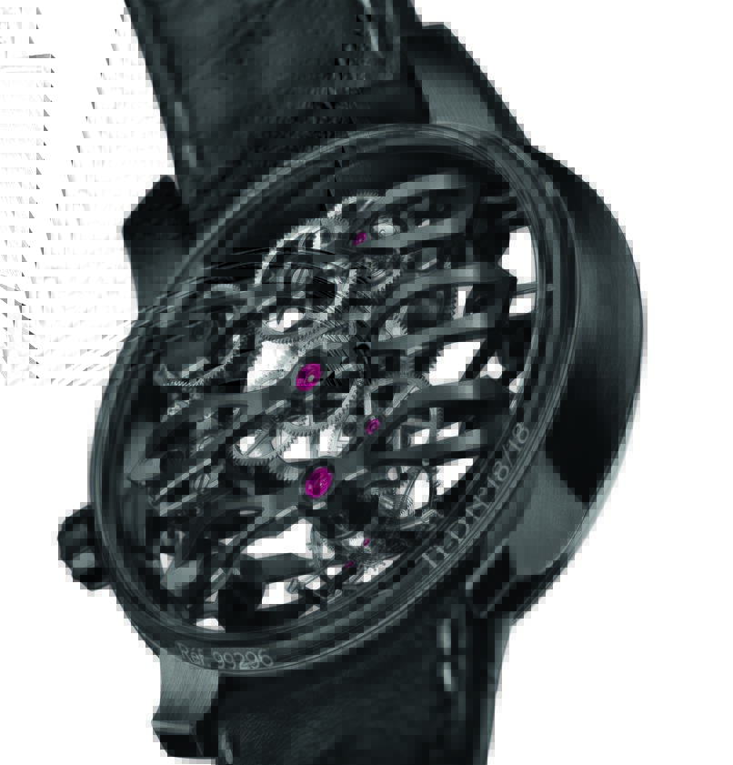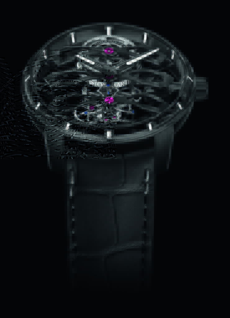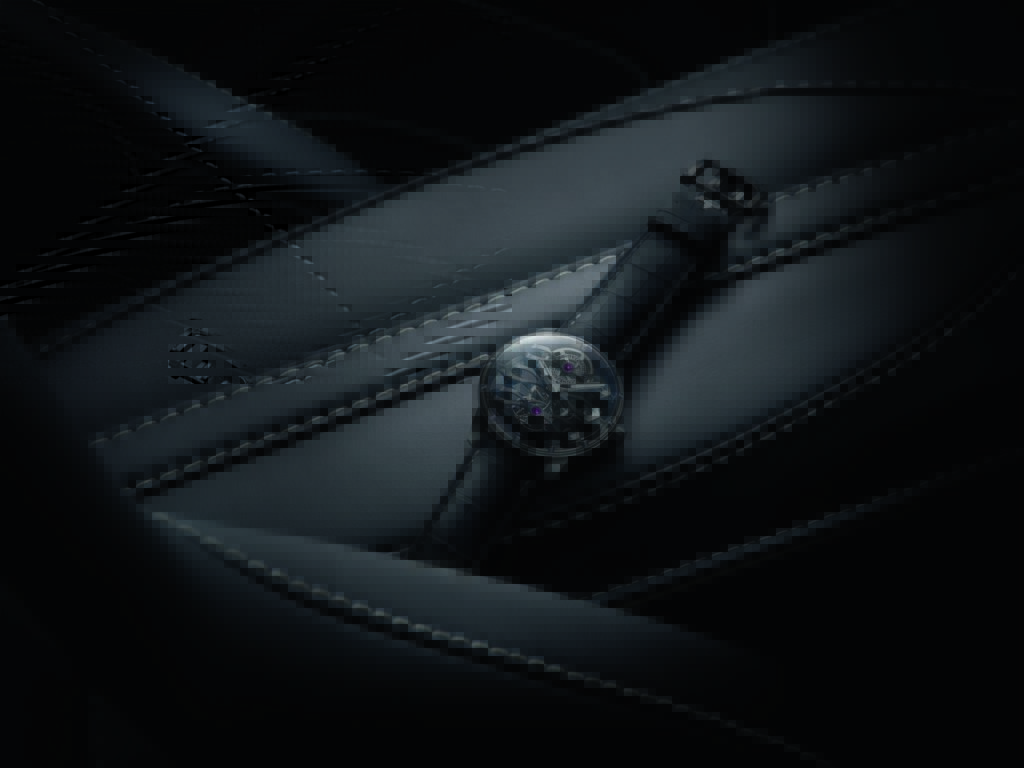 Le boîtier de 44 millimètres du Tourbillon sous Trois Ponts volants – Édition Aston Martin est composé de titane grade 5, un alliage hypoallergénique résistant sélectionné par Aston Martin pour sa légèreté. Il est revêtu de DLC noir qui confère à la montre une apparence discrète. Coïncidence de l’histoire, c’est en Grande-Bretagne, patrie d’Aston Martin, que le minerai de titane a été découvert par un membre ecclésiastique anglais, William Gregor, en 1791 – l’année même où la manufacture Girard-Perregaux a été fondée.