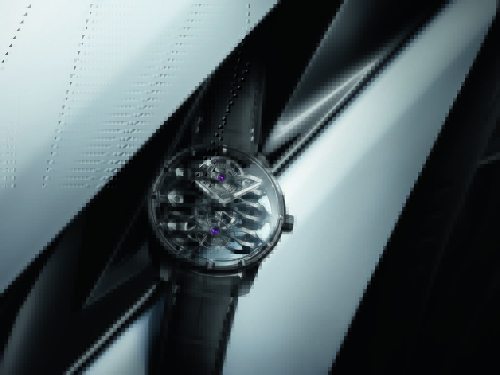 Une « boîte » en glace saphir habille le dessus et le dos du boîtier, permettant le passage de la lumière à l’intérieur du boîtier, pour une meilleure lisibilité. Le mouvement élude une platine ; logé entre les deux plaques de glace saphir, il semble flotter dans les airs. Signature emblématique de Girard-Perregaux, trois ponts traversent tout le cadran. Ils sont composés de titane avec un traitement en PVD noir et pourvus d’angles polis. Le design confère au garde-temps une silhouette aérienne et offre une vue exceptionnelle sur les composants du mouvement habituellement cachés. Tandis que Girard-Perregaux est traditionnellement connue pour rendre visible l’invisible, elle s’est aventurée cette fois en hors-piste pour créer une montre dont le mouvement semble être en lévitation à l’intérieur du boîtier. Cette prouesse est obtenue grâce à un mouvement réduit à l’essentiel, faisant disparaître la platine dans le boîtier et créant l’illusion d’un mouvement ‘volant’ à l’intérieur du boîtier. C’est cette caractéristique particulière qui a donné naissance au terme ‘ponts volants’.