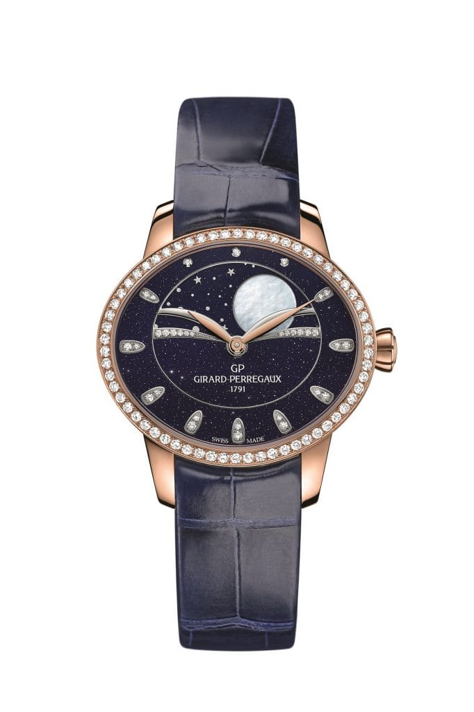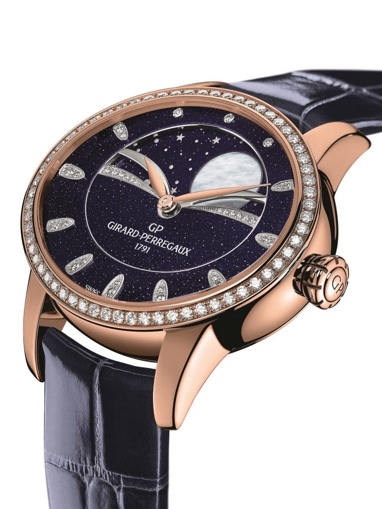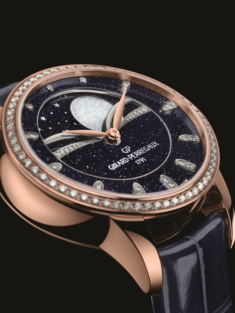 La voûte céleste est le royaume de la lune. Pour l’incarner, l’aventurine présente autour de la complication ainsi que sur le disque accueillant la lune de nacre apporte des profondeurs insoupçonnées. Les inclusions scintillantes font écho à l’éclat des diamants symbolisant les heures. Seul un mouvement manufacturé selon les critères de Girard-Perregaux pouvait permettre ce voyage au bout de la nuit et de la précision. La Cat’s Eye Celestial est animée par un mouvement Maison, conçu, développé, fabriqué et fini dans la plus pure tradition de la Haute Horlogerie. De Murano à la Suisse, les objets d’exception poursuivent la même vocation, celle de susciter une extraordinaire émotion.