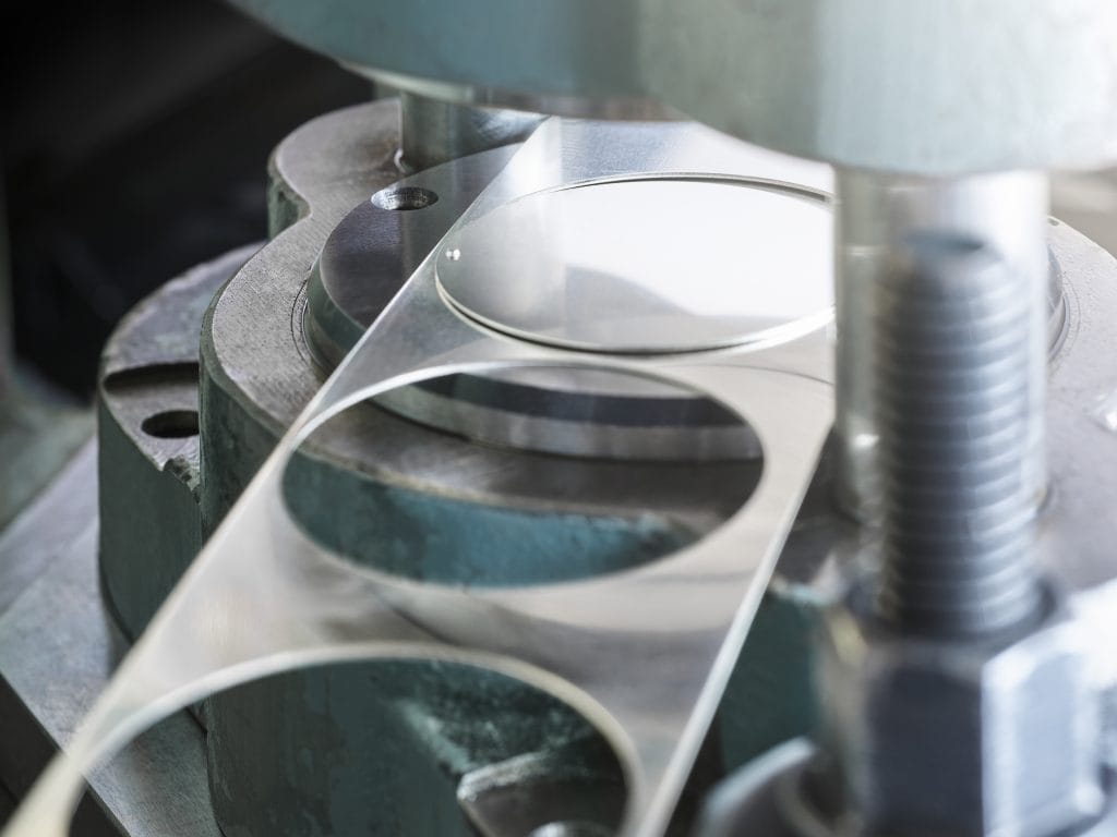 Cela commence par l’estampage précis de l’ébauche en maillechort qui marque le début de la fabrication d’un cadran Sixties édition 2018. Au cours d’une seconde étape, le poinçonnage de l’extravagante structure de surface est réalisé d’après un modèle historique. Une presse de 60 tonnes permet de marquer le remarquable motif sur l’ébauche – comme il y a plus de 50 ans à Pforzheim, là où déjà les cadrans étaient fabriqués pour la manufacture Glashütte. Le poinçon et son motif en filigrane datent de cette époque.