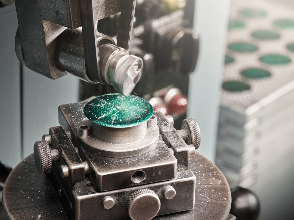À ce stade, la taille, la forme et la structure du cadran sont définis. Viennent ensuite les étapes au cours desquelles cette ébauche seulement usinée se transforme en visage d’un garde-temps. Avant de recevoir sa finition en « dégradé », plusieurs couches d’un verni vert puissant sont apposées sur le cadran préalablement galvanisé. Pour obtenir cet effet, une peinture noire est pulvérisée avec précaution