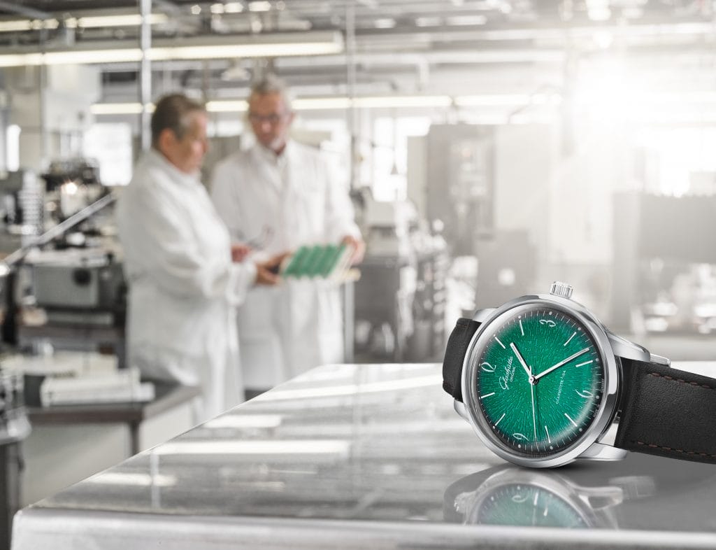 Depuis leur présentation en mars 2018, les montres Sixties sont parmi les plus populaires de la collection de Glashütte Original : éditées en 2018, les Sixties vertes et les Sixties Date Panorama attirent l’attention les amateurs de montres vintage du monde entier – notamment en raison de leurs remarquables cadrans. Pas moins de 25 étapes de travail sont nécessaires pour donner au cadran de ces garde-temps leur aspect unique. Les cadrans sont produits au sein de la manufacture de Glashütte Original à Pforzheim, où l’on s’inspire régulièrement du passé lors de leur fabrication moderne et majoritairement manuelle.
