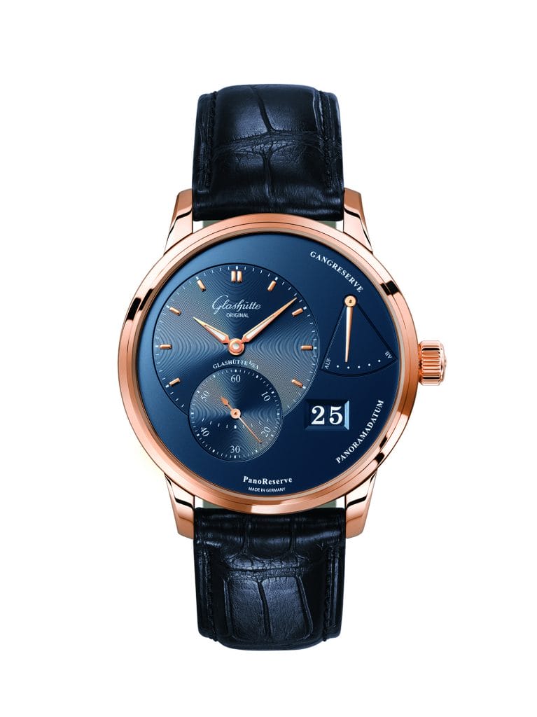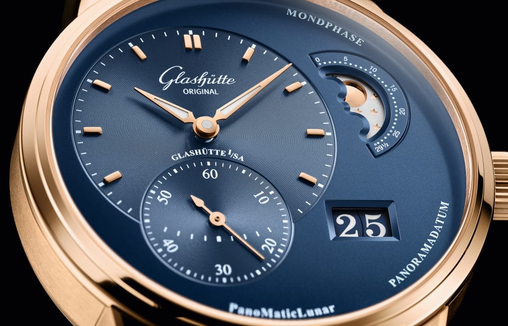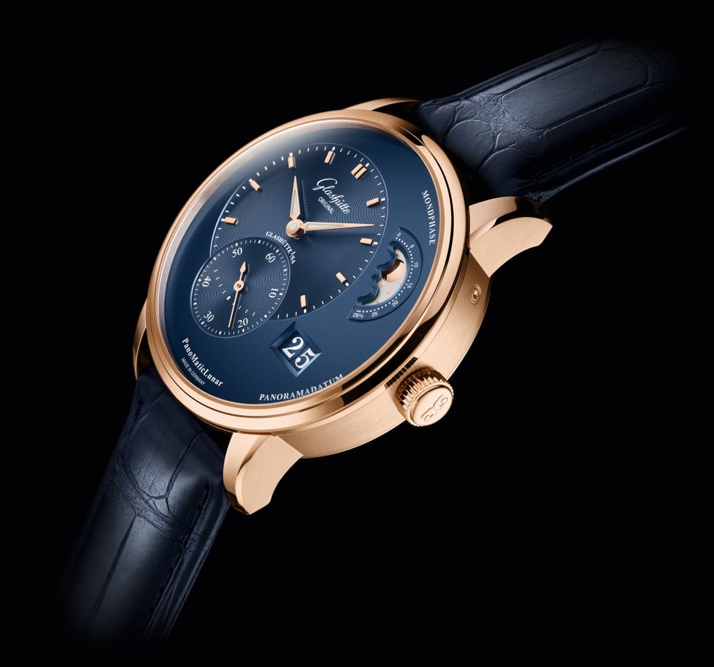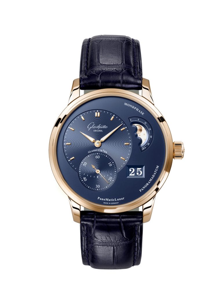 L’affichage en forme d’éventail de la réserve de marche de la PanoReserve est positionné à 2 heures tandis que les mentions décentrées « Panoramadatum » pour la Date Panorama et « Gangreserve » pour la réserve de marche rappellent les origines allemandes de la manufacture. Outre ce boîtier en or rouge et ce cadran bleu caractéristiques, les nouveaux modèles séduisent également par une superbe grande date dans les tons blanc et bleu. Sur la PanoMaticLunar, l’affichage raffiné de la phase de lune révèle un disque sophistiqué où l’astre doré évolue sur un firmament argenté. Les différents affichages sont agencés sur le cadran selon le nombre d’or, cette loi légendaire de l’harmonie esthétique qui inspire depuis des siècles artistes et architectes.