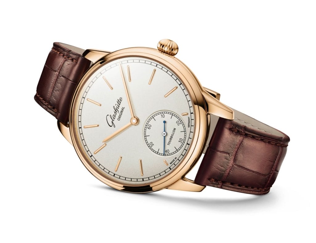 Le nouveau garde-temps de la maison Glashütte Original constitue un exemple d’élégance épurée, de raffinement technique et de savoir-faire d’exception. Limité à 25 exemplaires, ce précieux chef-d’œuvre possède un boîtier en or rose. Le cadran en or massif arbore une finition plaquée argent réalisée à la main par friction. Une indication d’heure de type chemin de fer ainsi que des index appliqués confèrent au garde-temps un élégant visage classique. Cette esthétique discrète est renforcée par des aiguilles bâtons filigranées en or rose.