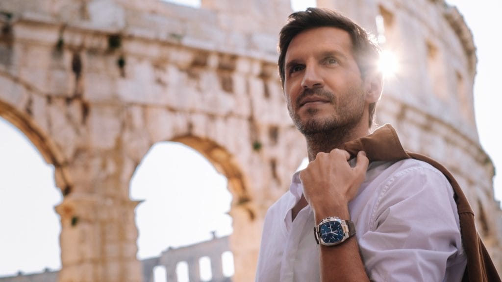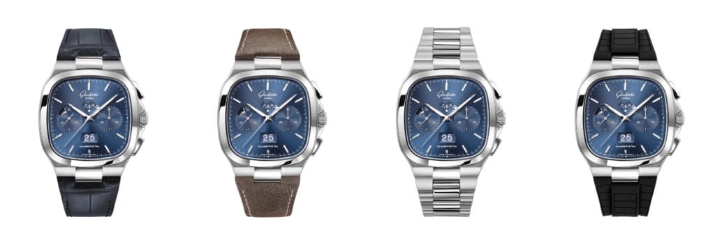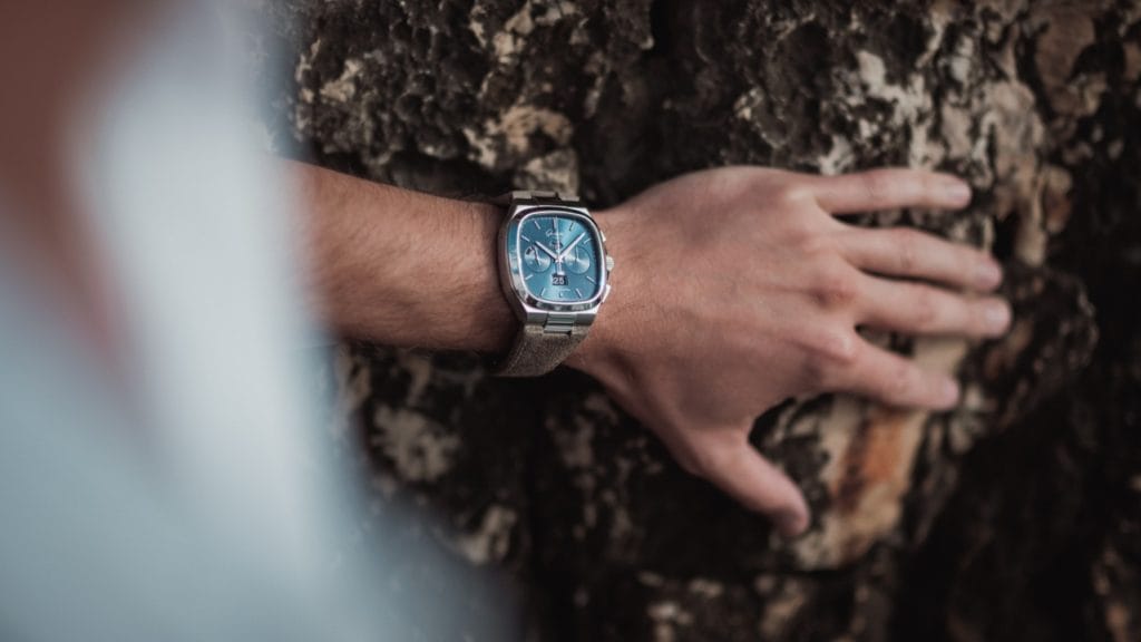 Le généreux boîtier en acier de 40 mm par 40 mm, doté d’angles arrondis, est emblématique de la ligne Seventies. Il lui confère son caractère vintage, à la fois raffiné et inimitable. Ce nouveau modèle est proposé avec quatre matières de bracelet au choix : alligator de Louisiane bleu, cuir nubuck gris brun, caoutchouc noir ou acier froid intégral. Un fond en verre saphir permet d’admirer l’intérieur du chronographe robuste, étanche jusqu’à une pression de 10 bars (100 m).