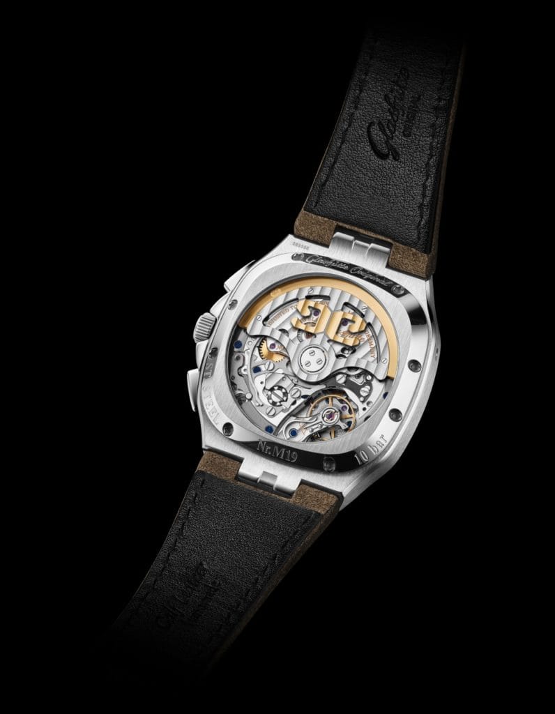 Même si la Seventies Chronographe Date Panorama est en apparence une enfant des années 70, elle abrite en son cœur un mouvement automatique contemporain, méticuleusement décoré à la main. Le calibre de manufacture 37-02 se distingue non seulement par une remarquable réserve de marche pouvant aller jusqu’à 70 heures, mais également par des finitions parfaites, exécutées dans le strict respect de la tradition horlogère de Glashütte : il arbore des arêtes anglées et polies, des vis bleuies et polies ainsi que des ponts, un coq de balancier et un rotor squelette décorés de la célèbre finition côtes de Glashütte.