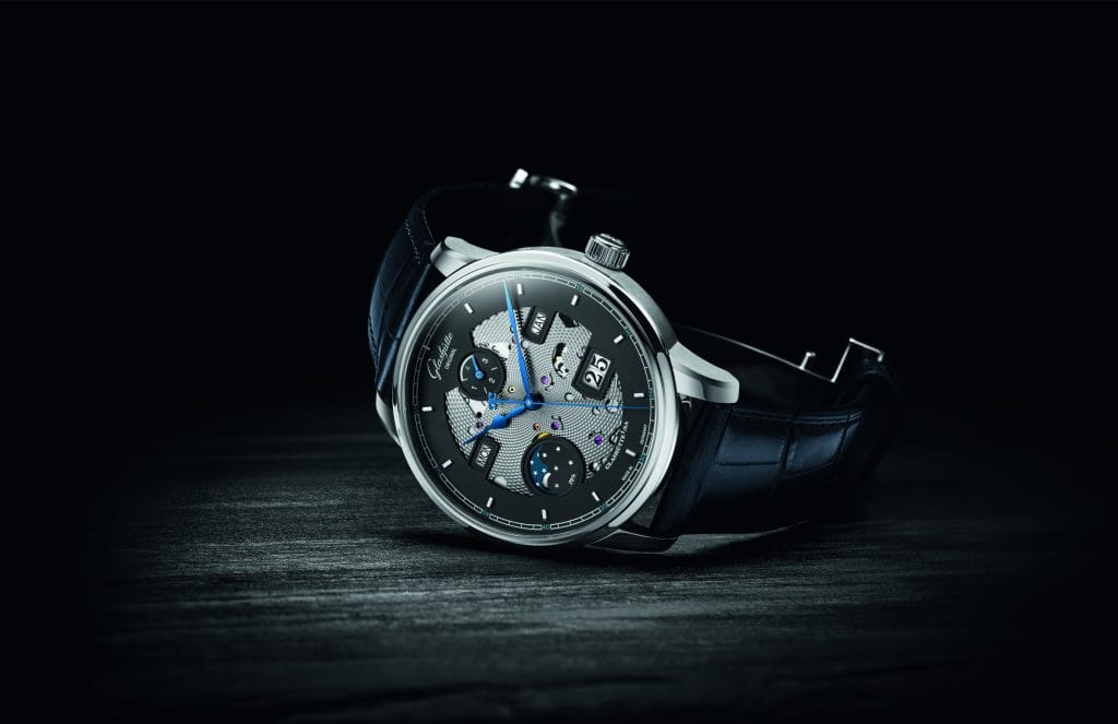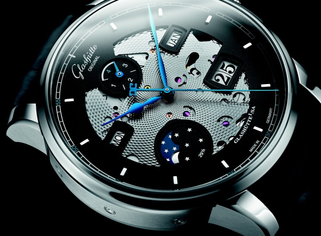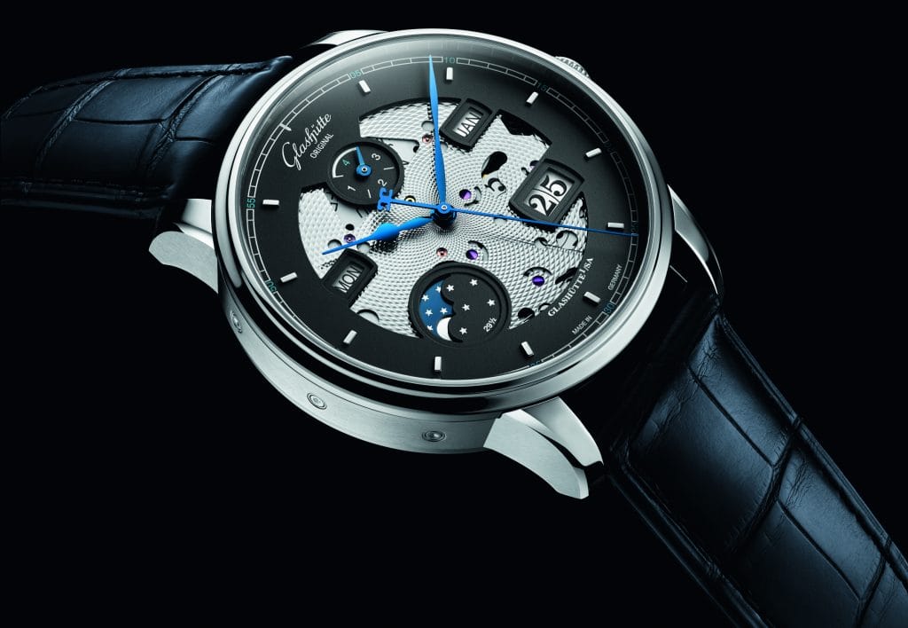 Le squelettage, technique de découpe en filigrane de certains composants, fait depuis longtemps partie du répertoire des grands horlogers. Glashütte Original a recours désormais à cette technique pour proposer un design moderne et frais. La bague d’un cadran gris aux découpes généreuses abrite plusieurs affichages – Date Panorama, phase de lune, jour de la semaine, mois et année bissextile – chacun mis en valeur par un petit décrochement.