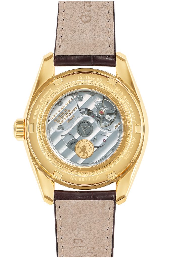 Le 20e anniversaire du calibre 9S est célébré par deux autres éditions limitées. Si le boîtier de la première est en or 18 carats et celui de la seconde en acier inoxydable, ces deux éditions ont en commun le design de la V.F.A., le calibre 9S85 et le même cadran. La version en or est toutefois réglée selon le standard Grand Seiko ‘Special’, avec une marche diurne de -2 à + 4 secondes par jour. Comme sur la version V.F.A., la masse oscillante est ornée de l’emblème du lion Grand Seiko en or 18 carats, qui en symbolise l’extrême précision. La version en acier inoxydable possède aussi une masse oscillante spéciale, fabriquée en tungstène et titane, cette dernière partie étant colorée en bleu par un processus d’oxydation anodique.*