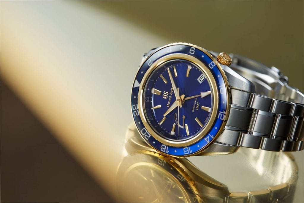 Cette nouvelle Grand Seiko SBGE248 utilise une lunette tournante en or jaune 18 carats, qui est une première pour Grand Seiko. Le contraste entre l’or jaune de la lunette, des index, et de la couronne, avec le bleu de l’insert gradué sur 24 heures offre une nouvelle palette de couleurs de la collection sport.