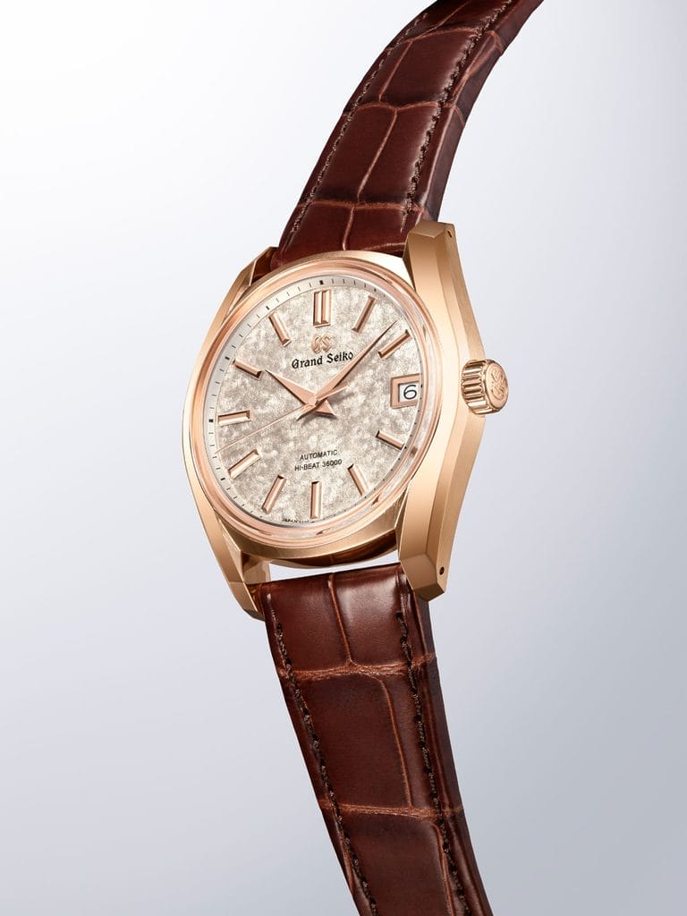 Le cadran texturé, aux subtils reflets rose cuivré, s’inspire du phénomène naturel du Sakura-Kakushi. Ce spectacle éphémère, propre à la région de Tōhoku, voit les dernières neiges du printemps recouvrir délicatement les cerisiers en fleurs, créant un contraste saisissant.