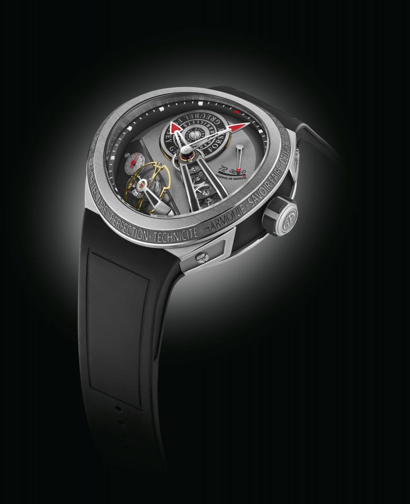 Depuis 2004, Robert Greubel et Stephen Forsey créent des mécanismes novateurs. L’esprit ’invention et la créativité sont deux brins fondamentaux tissant l’ADN de Greubel Forsey. Les deux maîtres d’œuvre explorent également de nouvelles voies dans l’architecture des boîtiers – et dans son alliance étroite avec celle des mouvements. Fin 2019, Robert Greubel et Stephen Forsey ont franchi une étape remarquée en lançant, avec la GMT Sport, un tout nouveau boîtier aux lignes sculpturales conjuguant ergonomie, confort et robustesse. Dans cette approche pionnière, Greubel Forsey poursuit aujourd’hui dans la veine sportive en proposant une réinterprétation de ce boîtier au design très typé, mariée à une mécanique inédite. On retrouve le boîtier au style original, rond vu de dessus, mais révélant une forme ovoïde arquée dès qu’on le regarde sous un autre angle, ainsi que la large lunette satinée sur le biseau de laquelle sont gravées les valeurs Greubel Forsey et les cornes intégrées épousant le poignet. Mais dans le nouveau «Balancier S », ce boîtier se distingue par un profil aminci, qui renforce son dynamisme et son élan conquérant. Il se démarque aussi par sa couronne et ses flancs de carrure dotés d’inserts en caoutchouc assurant une meilleure prise en main et protection du Garde-temps. Le verre saphir ovoïde et arqué suit la courbure du boîtier. L’osmose parfaite entre le boîtier et le mouvement est soulignée, sur le plan technique L’alliance exclusive entre chronométrie et sportivité et visuel, par un audacieux double «pont arche» suspendu intégrant un train de rouage incliné ainsi que par des aiguilles centrales des heures et des minutes galbées. Ces éléments marquants surplombent l’organe réglant incliné qui donne à la montre sa forte identité, mais aussi ses performances chronométriques hors pair.
