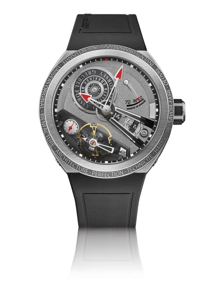 Avec ses deux barillets coaxiaux montés en série, le mouvement totalisant 308 composants offre une réserve de marche chronométrique de 72 heures, indiquée sur un secteur à 2h à l’aide d’une aiguille ajourée à pointe rouge. L’affichage central des heures et des minutes, doté d’aiguilles en acier poli galbées et ajourées, est complété par une petite seconde placée de manière inédite sur le plan incliné du porte-échappement à 8h, ce qui accentue les jeux de relief et de profondeur. Comme dans toute création signée Greubel Forsey, l’innovation technique et architecturale s’allie à une extrême bienfacture au niveau de tous les composants du mouvement – que ces derniers soient visibles par le verre et le fond transparent ou qu’ils soient cachés dans les arcanes de la mécanique. Ce savoir-faire artisanal traditionnel, et irremplaçable, est maîtrisé au sein de l’Atelier Greubel Forsey – qu’il s’agisse des décors grenés, des anglages et moulures polis, du cerclage ou du satinage ennoblissant les moindres surfaces. L’utilisation de titane pour la platine, les ponts et le porte-échappement accroît encore le défi technique et esthétique, ce métal étant nettement plus difficile à travailler au niveau des finitions manuelles que les habituels acier et maillechort.