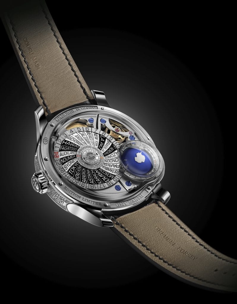 Robert Greubel et Stephen Forsey repoussent encore une fois les frontières du possible avec cette nouvelle création qui permet une extraordinaire vision spatiale de notre planète, la Terre , du pôle Nord au pôle Sud. Cette prouesse technique a été rendue possible grâce au judicieux réagencement de l’architecture du mouvement et de la boîte. L’usage du saphir nécessite un grand savoir-faire que Greubel Forsey a acquis au cours de nombreuses années de recherche et d’applications. Il permet également la mise en évidence du globe terrestre dans son intégralité.