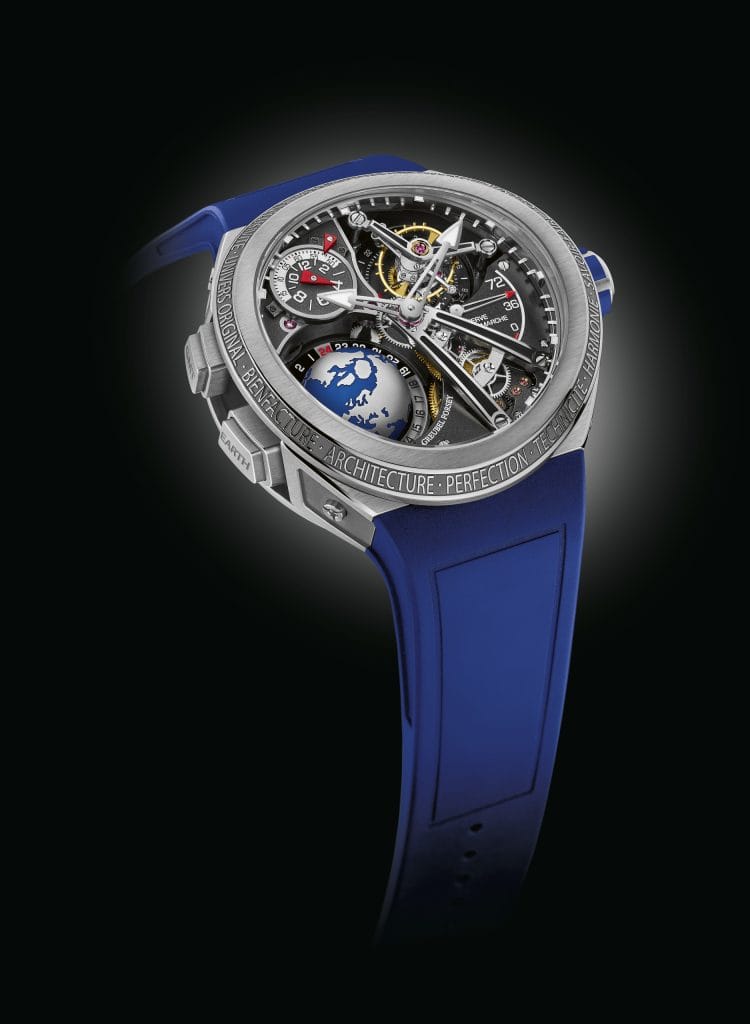 A ce fleuron de précision et de fiabilité, Greubel Forsey a marié sa vision originale de l’affichage GMT, présenté pour la première fois en 2011 et réinterprété en 2015 avec la GMT Black. Dans ce système doublement breveté, l’indication d’un second fuseau horaire sur le cadran auxiliaire à 10h30 s’allie à une heure universelle permettant de lire de manière intuitive toutes les heures du monde grâce à une innovation très remarquée: un globe terrestre miniaturisé effectuant un tour complet sur lui-même en 24 heures dans le sens contraire des aiguilles d’une montre, à l’image de notre planète. Le spectacle saisissant de la Terre en mouvement, vu depuis le dessus du pôle Nord, est entouré par une bague avec inscription des 24 heures ; l’utilisateur peut ainsi lire l’heure locale pour toutes les longitudes, en tenant compte de l’indicateur jour/nuit (zone claire/zone foncée). Au dos de la GMT Sport, un disque des villes en saphir complété par deux anneaux permet de lire l’Heure universelle UTC ainsi que l’heure d’été dans les 24 villes correspondant aux principaux fuseaux horaires. Ce disque distingue également les fuseaux appliquant l’heure d’été (couleur claire) de ceux n’y ayant pas recours (couleur foncée). Par souci de fonctionnalité et d’ergonomie, les corrections du système GMT s’effectuent à l’aide de deux poussoirs situés sur le flanc gauche du boîtier, l’un pour le second fuseau horaire, l’autre pour le globe rotatif. La couronne en titane et caoutchouc assure aussi une maniabilité optimale.