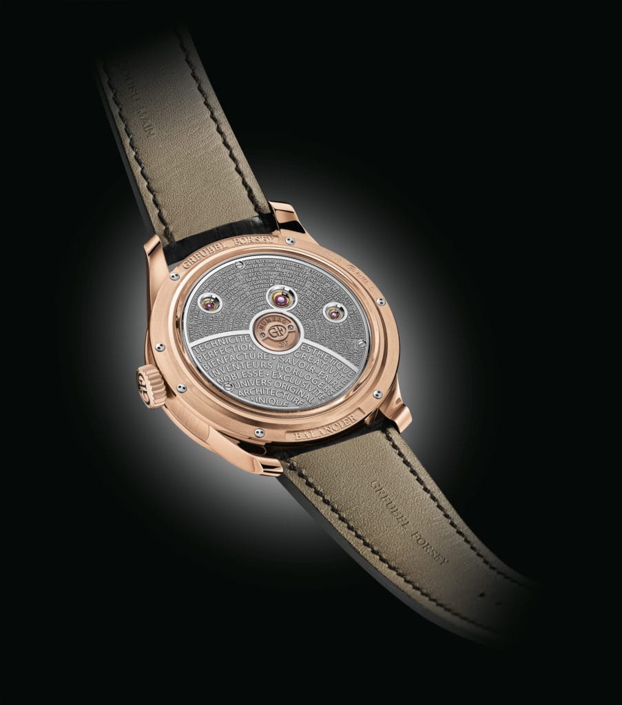 Au dos de cette création se cache une œuvre artistique réalisée avec toute la maîtrise des finitions artisanales des Garde-temps Greubel Forsey. Une plaquette circulaire en or rouge gravée figure en son centre, autour de laquelle se déploie un pont en or gris où l’on peut découvrir les valeurs des fondateurs sur des mots gravés en relief puis polis noir, ainsi que des rubis enchâssés dans des chatons en or.