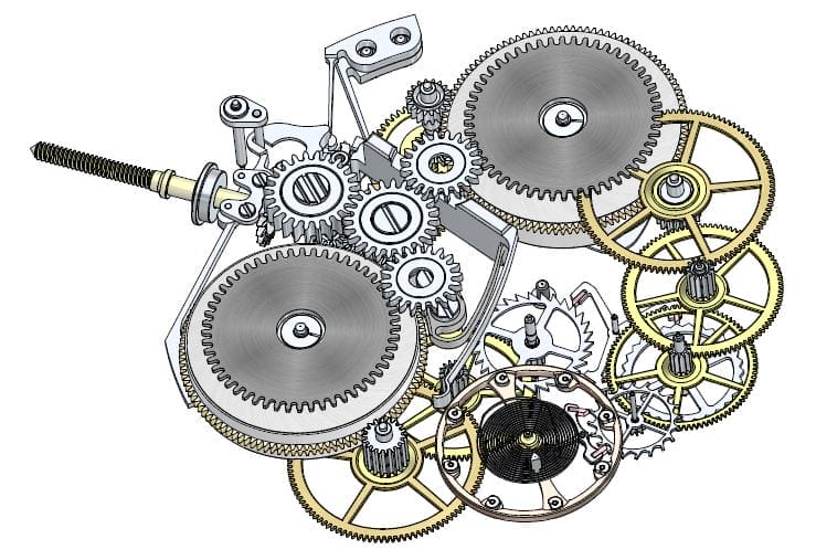 Au cœur du mécanisme, même constat : chacun des trains de rouages (heures-minutes d’un côté, secondes mortes de l’autre) est alimenté par son propre barillet de manière à répartir de manière homogène et sans interférences l’énergie. Et si le balancier spiral est commun aux deux parties, un second système d’ancre spécifique vient redécouper la fréquence sur une roue supplémentaire qui fait donc avancer la trotteuse d’une seconde à chaque battement. C’est là que réside toute l’originalité technique du mécanisme imaginé par Tim et Bart.