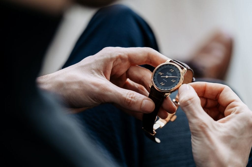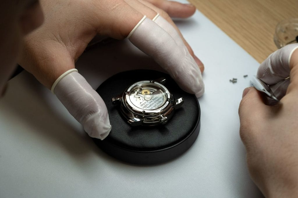 Le boîtier en acier inoxydable de 39mm de diamètre, entièrement poli, a été conçu en trois parties : la lunette surmontée d’un verre saphir légèrement bombé, le corps du boîtier et le fond de boîte.
