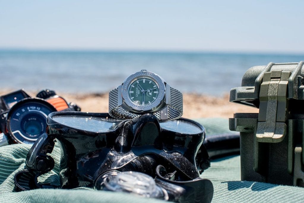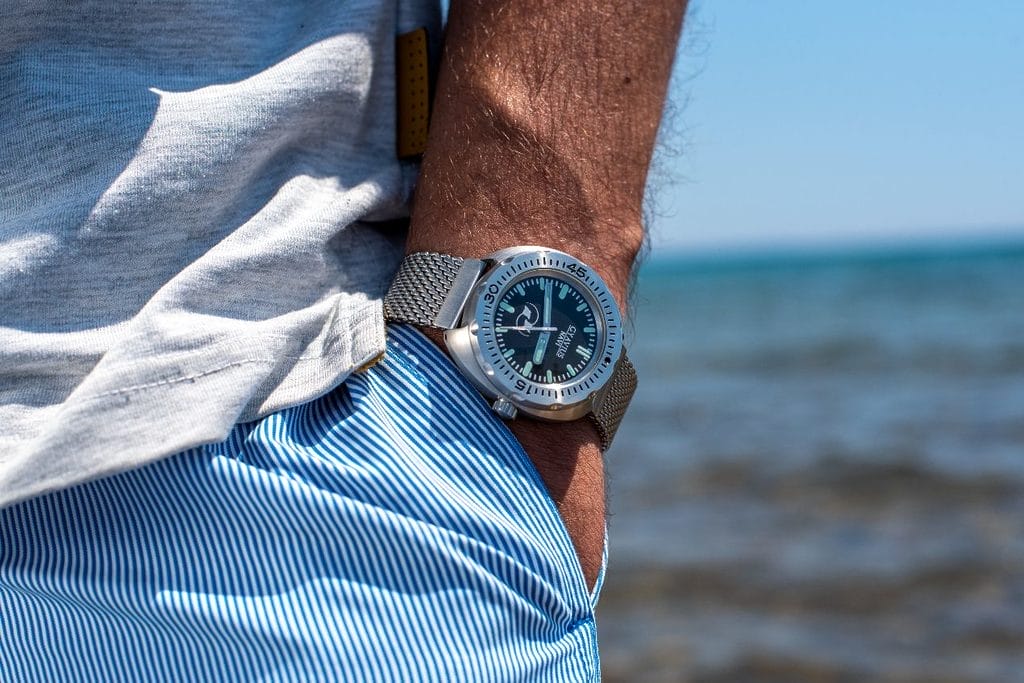 Sous le capot ? Le fiable Sellita SW200 automatique suisse, un mouvement de 26 rubis battant à 4 Hz. Une réserve de marche de 41 heures. Heures, minutes et seconde centrale balayante livrées avec la précision d’une montre… suisse ? Le verre minéral a été remplacé par un saphir double dôme, la couronne vissée bénéficie d’un double joint, et l’ensemble est renforcé jusqu’à 100 ATM. La lunette bidirectionnelle clics en 60 positions pour rythmer votre quotidien. Un fond plein protège les entrailles. Les bracelets ? Les barrettes de 20 mm accueillent un caoutchouc FKM et une maille acier fluide comme un liquide.
