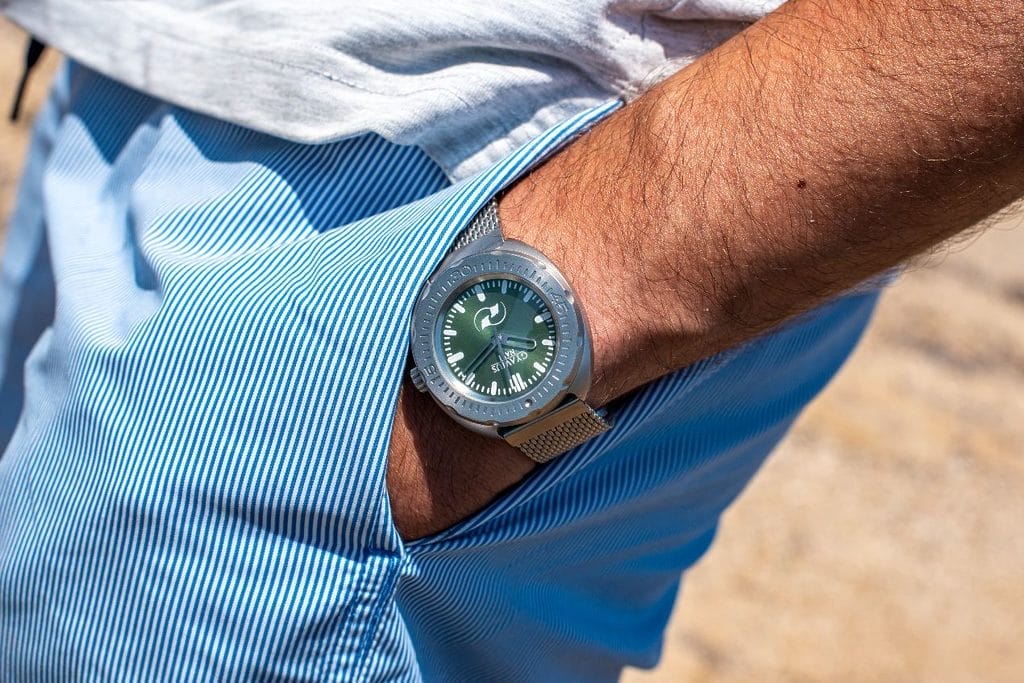 • Cadran vert menthe soleillé dans un boîtier microbillé : une explosion lumineuse de menthe mêlée à un boîtier mat d’inspiration plus contemporaine (curieusement inspiré de l’intérieur en cuir d’un vieux Range Rover — parce que le vrai style sait emprunter aux routes les moins fréquentées).