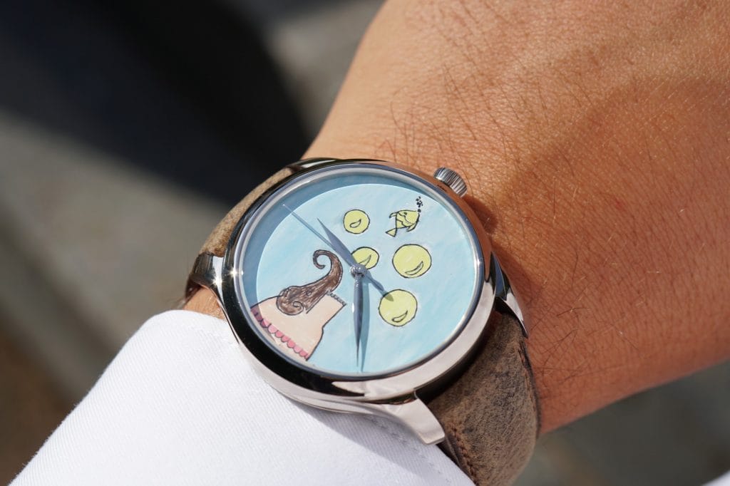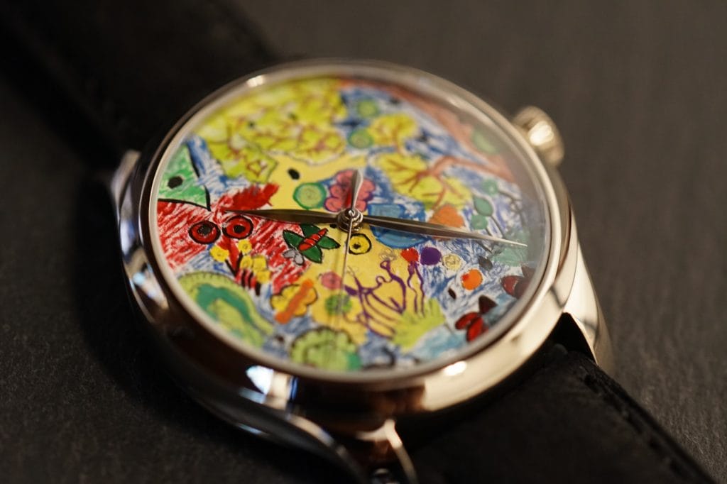 Afin de renforcer le partenariat qui la lie à Room to Read, H. Moser & Cie. a créé deux pièces uniques très spéciales : avec l’aide de Room to Read, la manufacture a demandé à deux classes de jeunes bénéficiant du soutien de Room to Read dans le cadre de leur scolarisation de laisser libre cours à leur imagination et de créer un dessin, en Inde et au Sri Lanka. Deux illustrations sont sorties du lot, tant pour la beauté des couleurs choisies que pour le style des motifs : celles d’Arif et de Kasun. Inspirés, Arif et Kasun ont mis dans leur œuvre autant de motivation et d’efforts que dans leur quotidien, à l’école et en-dehors. Vivant à Mumbai, Arif doit marcher plusieurs kilomètres pour rejoindre son école. Son père est vendeur de fruits ; lui aimerait devenir policier. Kasun quant à lui habite au Sri Lanka et se rend à l’école en mobylette avec son papa, qui est fermier. Le petit garçon rêve d’être médecin. Tous deux étaient ravis et fiers que leur dessin ait été choisi pour les cadrans des deux pièces uniques Moser créées pour venir en aide à des enfants défavorisés à travers l’éducation. H. Moser & Cie. a demandé à un artiste de reproduire les dessins à la main sur les cadrans de ses créations. Muni de petits pinceaux, cet artisan a mis tout son cœur et son savoir-faire afin de respecter le plus fidèlement possible les œuvres des enfants, tant au niveau des couleurs chatoyantes que des motifs. En tout, il a consacré deux jours de travail au cadran de Kasun et trois jours à celui imaginé par Arif. Les deux modèles seront vendus aux enchères au profit de l’organisation. Une jolie manière de faire rayonner l’engagement de H. Moser & Cie. en matière de développement durable.