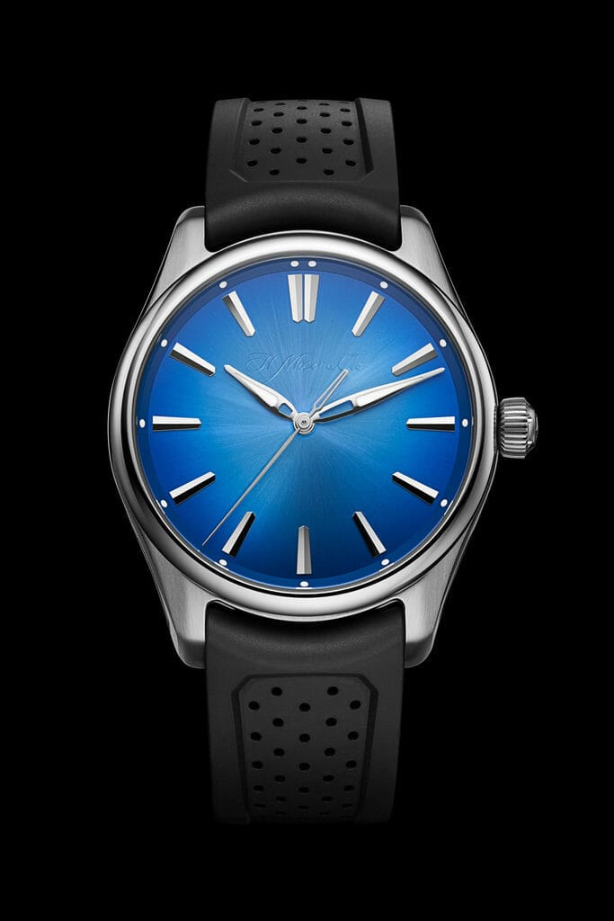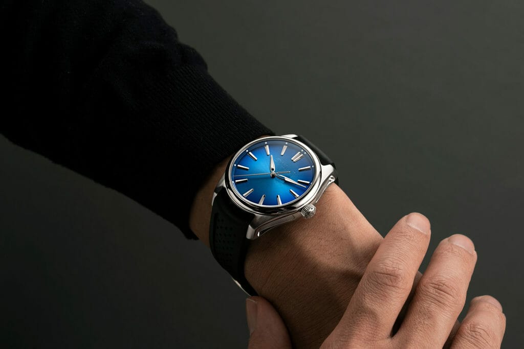 Le Pioneer Centre Seconds Arctic Blue est équipé quant à lui du mouvement automatique HMC 200. Conçu, développé et produit en interne, ce calibre est muni d’un organe réglant manufacturé en interne. Décoré des fameuses doubles côtes de Moser sur les ponts et la platine, arborant une grande masse oscillante gravée, le HMC 200 est 100% suisse, 100% Moser, et garantit une réserve de marche de trois jours minimum.