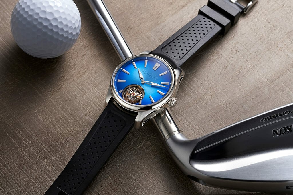 Au cœur du Pioneer Tourbillon Arctic Blue vibre une véritable merveille d’ingéniosité. Le calibre manufacture HMC 804 à remontage automatique est muni d’un double spiral conçu et produit en interne par Precision Engineering AG, la société sœur de H. Moser & Cie. Grâce à cette paire de spiraux concordants, le déplacement du point de gravité subi par chaque ressort lors de son expansion est corrigé, améliorant de façon significative la précision et l’isochronisme dans une recherche de perfection continue. De plus, les spiraux appariés réduisent également l’effet de friction que l’on rencontre normalement avec un seul spiral, d’où un isochronisme optimisé. Enfin, grâce à une conception unique, le tourbillon est un module interchangeable, assemblé et régulé indépendamment du mouvement par un simple système de « plug and play », pour un entretien facilité. Il en résulte un tourbillon plus adapté aux besoins des utilisateurs, à une époque où l’on saute de son travail à la salle de sport, puis vers sa famille. Le Pioneer Tourbillon Arctic Blue s’inscrit parfaitement dans l’air du temps, alliant esthétique, élégance et modernité.