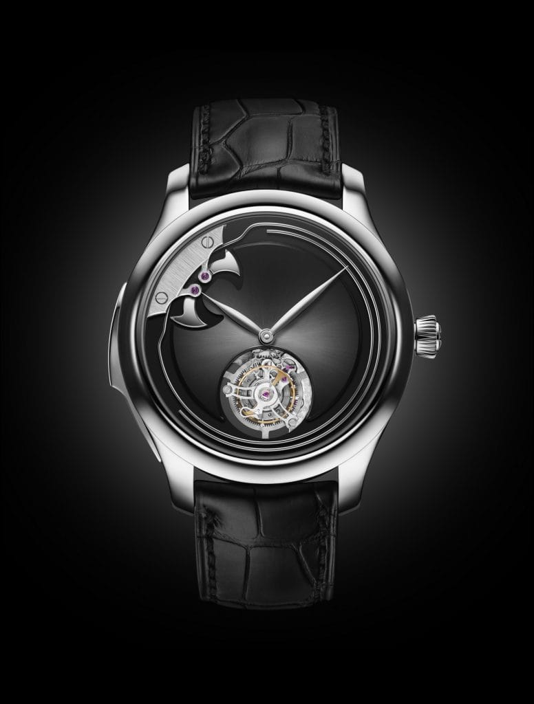 À six heures, le tourbillon volant une minute attire les regards. Visible derrière un pont squeletté, il est monté sur roulement à billes, ce qui améliore la précision et la chronométrie. Résolument contemporain et inscrit dans la modernité, le tourbillon semble flotter en apesanteur sur le cadran noir laqué dépouillé de tout logo et index. Le bracelet, en cuir d’alligator noir, vient parachever l’élégance de cette création en rupture avec les codes, qui revisite la plus romantique des complications avec une esthétique épurée et minimaliste.