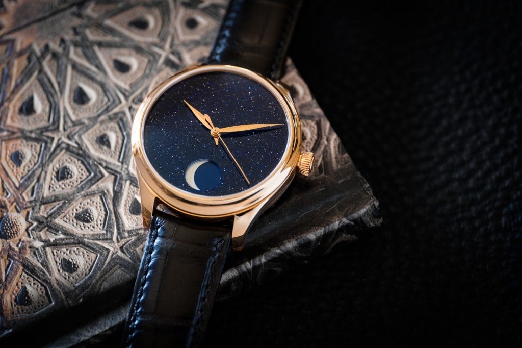 Avec le modèle Endeavour Perpetual Moon Concept Aventurine, c’est un voyage au cœur de la voie lactée que propose H. Moser & Cie., en accrochant non seulement la lune mais également les étoiles au poignet. Rendant hommage à l’astre lunaire, elle livre une interprétation à la fois minimaliste et extrêmement poétique de la phase de lune, dans une version munie d’un cadran en aventurine pailleté de lumière, sans index ni logo.