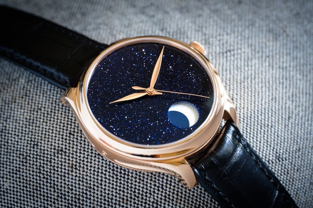À six heures, une lune argentée s’épanouit dans un guichet de belles dimensions. L’esthétique de l’astre est résolument moderne et épuré. Dans cette ode à la pureté, H. Moser & Cie. a opté pour un cadran Concept, sans logo ni index, de manière à laisser la lune s’exprimer en absolue liberté. Et comme la marque ne fait jamais les choses à moitié, quitte à offrir la lune, autant proposer les étoiles avec ! Pour sublimer la beauté de l’astre lunaire, elle a ainsi choisi un cadran en aventurine, subtilement muni d’inclusions brillantes reproduisant à merveille les constellations de la voûte céleste.