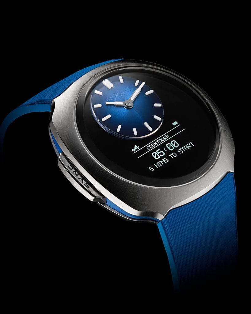 Ce modèle hybride combine un affichage numérique à une montre analogique traditionnelle. Lorsqu’elle est inactive, l’écran reste noir. À l’activation, il affiche les données essentielles : fuseaux horaires, chronographe, calendrier perpétuel et un mode dédié à la course avec compte à rebours et alertes spécifiques.