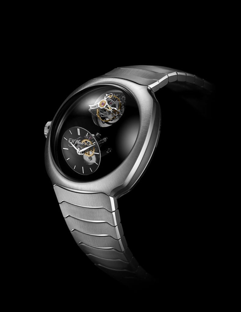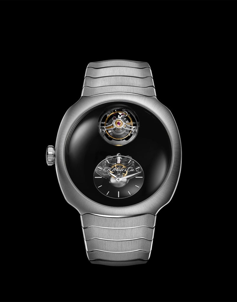 Montre de forme dotée d’un boîtier coussin en acier d’un diamètre de 40 mm étanche à 12 ATM, le Streamliner Cylindrical Tourbillon Only Watch est conçu comme une véritable sculpture et surmonté d’un verre saphir en forme de dôme. Son mouvement a été développé en collaboration avec MB&F pour une série spéciale lancée en 2020 et met en valeur le ballet du tourbillon volant 1 minute muni d’un spiral cylindrique. Inventé au XVIIIème siècle, le spiral cylindrique s’élève perpendiculairement autour de la tige supérieure de l’axe du balancier. Fréquent sur les chronomètres de marine à l’époque, il présente l’avantage de se développer de manière concentrique. Grâce au spiral cylindrique, muni d’une courbe Breguet aux deux points d’attache, le frottement des pivots est diminué et l’isochronisme grandement amélioré. Le spiral cylindrique, de par sa forme spécifique, est beaucoup plus difficile à produire, nécessitant dix fois plus de temps qu’un spiral traditionnel. Ce spiral a été développé et produit par Precision Engineering AG, la société sœur de H. Moser & Cie.