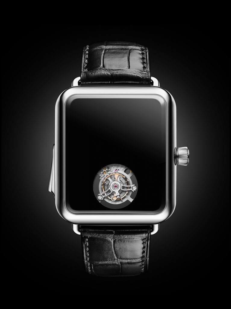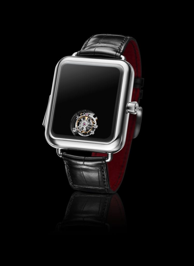 Moser & Cie. a fait de l’élégance son credo et du minimalisme sa signature. Avec la Swiss Alp Watch Concept Black, elle va encore plus loin. Après avoir supprimé son logo et les index du cadran de ses modèles Concept, voici maintenant une montre sans aiguille qui donne l’heure sans l’afficher. Sur le cadran noir brillant, il y a un tourbillon volant 1 minute à six heures et rien d’autre. Pour connaître l’heure, il faut tendre l’oreille. Comme à l’époque où l’usage de l’électricité n’était pas encore généralisé : les gens avaient alors recours aux répétitions minutes pour savoir quelle heure il était quand il faisait sombre. À travers ce joli clin d’oeil à la tradition horlogère de prestige, H. Moser & Cie. joue la carte des contrastes avec une création des plus minimalistes intégrant une répétition minutes et un tourbillon dans un boîtier rectangulaire évoquant les montres connectées.