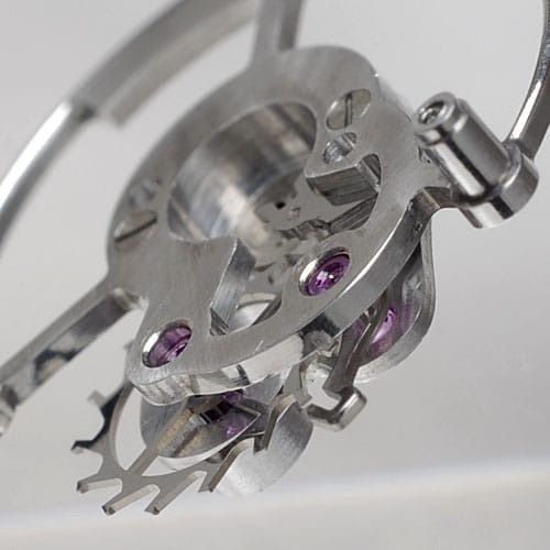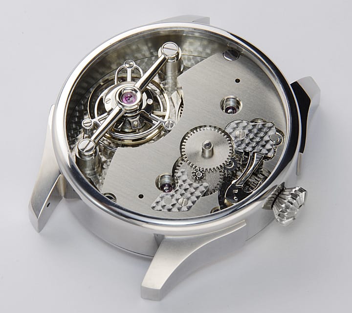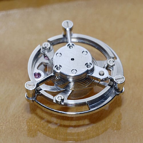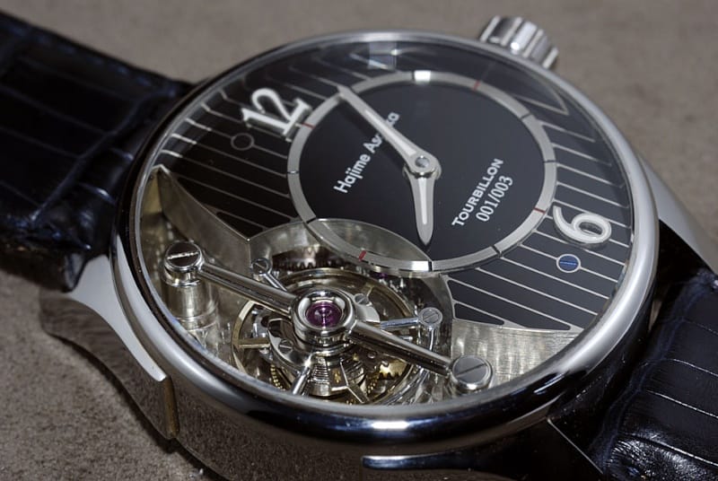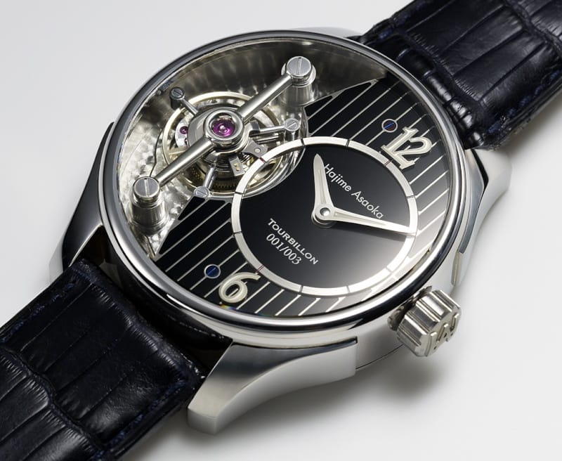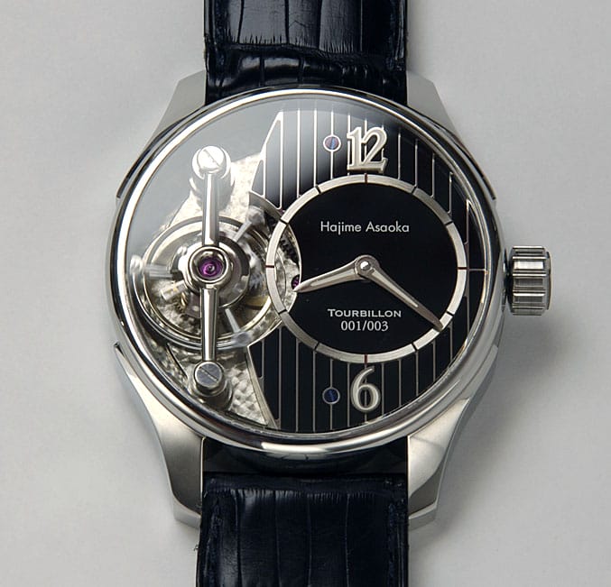Une montre tourbillon. Celle-ci est, dans sa présentation, d’une sobriété exemplaire. Calibre XT0901, 27 rubis, double barillet avec une réserve de marche de 42 heures. Alternance de 28800, boite acier d’un diamètre de 41 mm et 13 mm et d’épaisseur. Il a réalisé entièrement le calibre et la boite, le cadran étant confectionné en Suisse. La volonté de Hajime Asaoka est de devenir “indépendant”. Il l’est déjà en quelque sorte grâce à cette très belle montre équilibrée et sobre par sa discrétion.