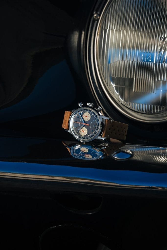 La troisième référence, sans doute la plus expressive, associe un cadran bleu à des touches orange, clin d’œil assumé aux codes graphiques du sport automobile. L’ensemble est complété par un bracelet en cuir nubuck brun, souple et résistant, qui évoque les matériaux patinés des habitacles de course d’antan.