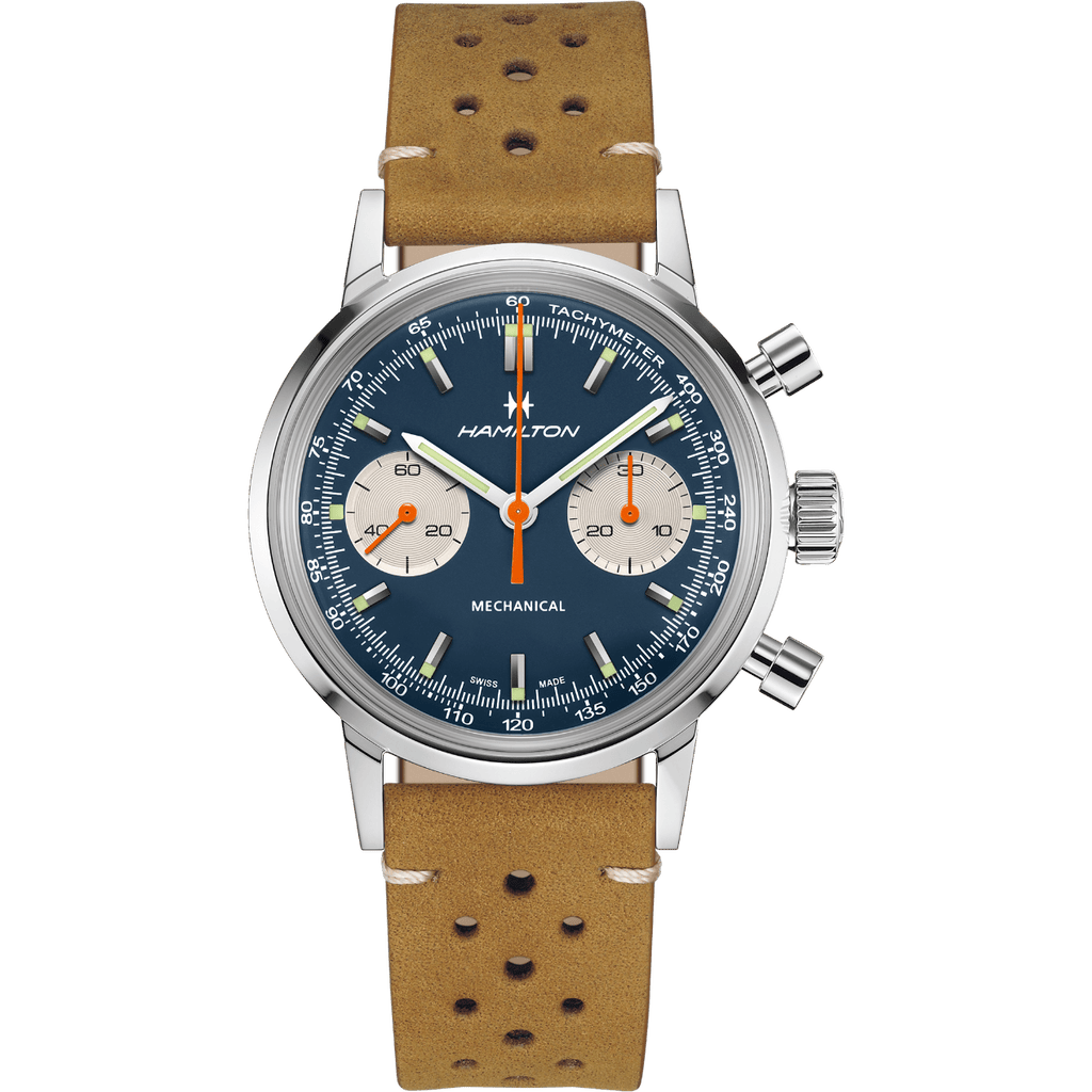 Fidèle à ses racines, l’American Classic Chronograph H fait le choix assumé d’un mouvement mécanique à remontage manuel. Elle est animée par le calibre H-51, développé par Hamilton, qui offre une réserve de marche confortable de 60 heures.