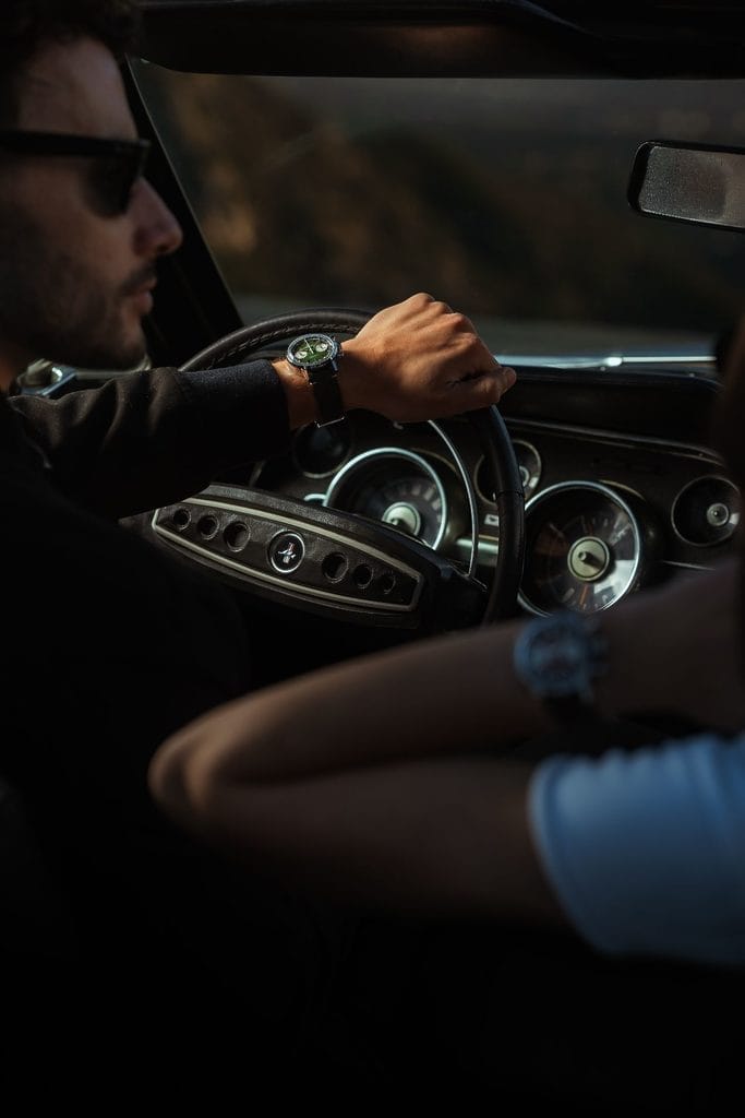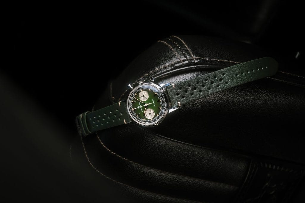 Les références racing de cette American Classic Chronograph H se retrouvent également dans les choix de composants. Les bracelets en cuir nubuck perforé évoquent les gants de conduite et les sièges des voitures de sport anciennes, tout en offrant respirabilité et confort au poignet.