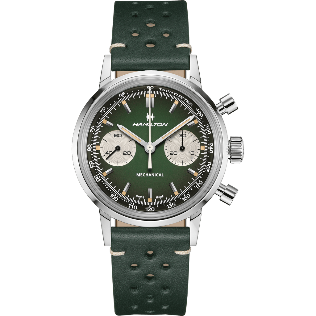 La nouvelle gamme American Classic Chronograph H se distingue immédiatement par son travail de couleur et de matière. Hamilton introduit des cadrans vert forêt et brun chaud, tous deux dotés d’un dégradé fumé qui s’assombrit vers les bords avant de s’éclaircir au centre. Ce traitement met en valeur la courbure du cadran et renforce la profondeur visuelle de la montre, tout en évoquant les tableaux de bord et compteurs des voitures de course d’époque.