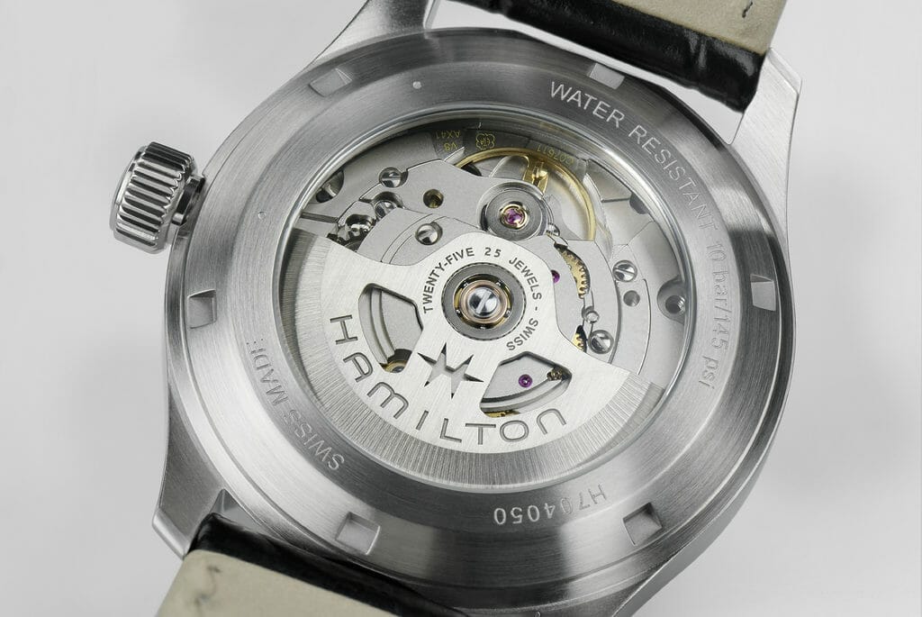 La Khaki Field Murph 38 mm est animée par le mouvement automatique H-10 doté d’une réserve de marche de 80 heures, visible à travers le fond du boîtier d’exposition.