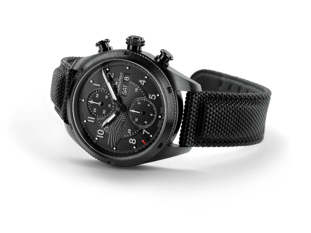 La couronne évoque le bouton de réglage d’une lunette de sniper, tandis que les poussoirs rappellent des cartouches de balles, autant de détails qui ancrent la montre dans l’ADN du personnage. Sur le cadran noir, une aile positionnée à 9 heures et l’emblème gravé au dos du boîtier symbolisent des prières adressées aux disparus, ajoutant une dimension émotionnelle forte à l’objet.