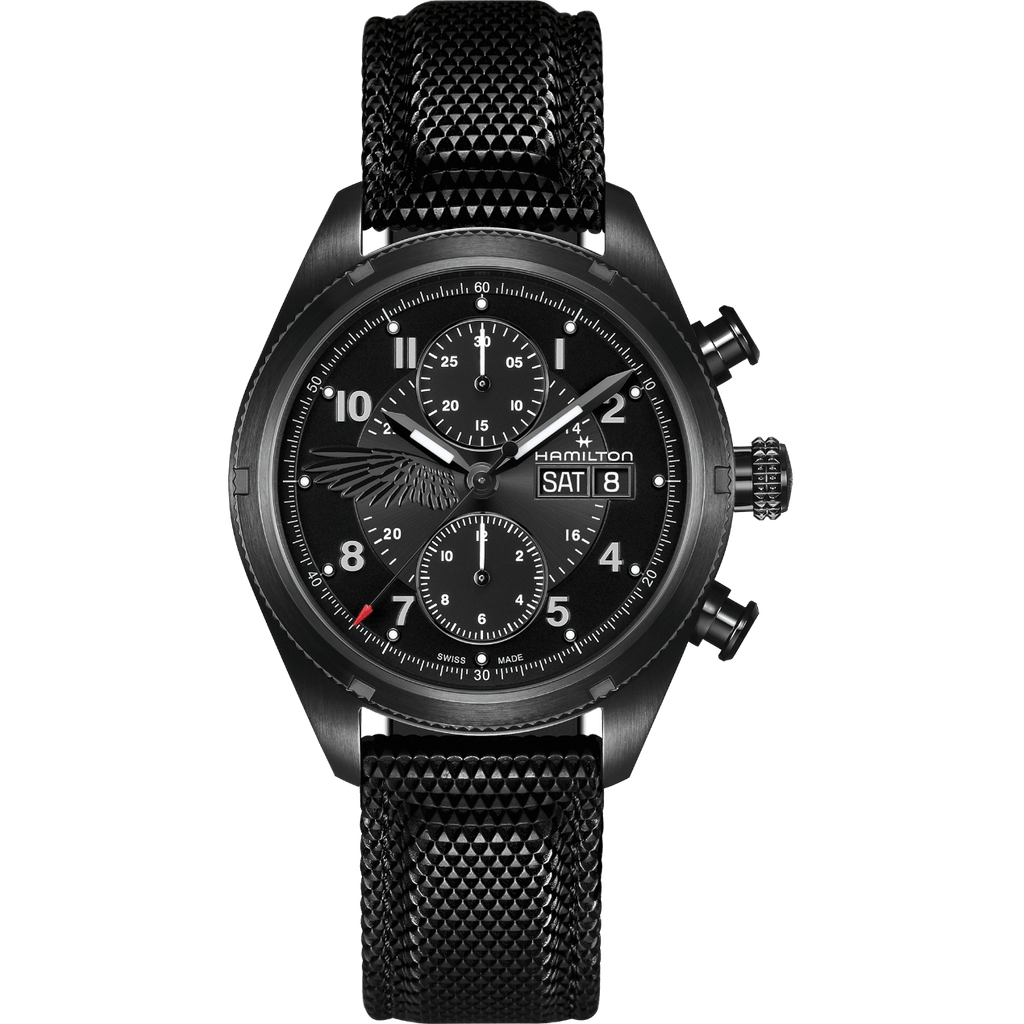 Le boîtier de 42 mm en acier avec revêtement PVD noir abrite le mouvement chronographe automatique H-21, offrant 60 heures de réserve de marche et intégrant lui aussi un spiral Nivachron. Lisible, fiable et étanche à 100 mètres, la Khaki Field Auto Chrono s’impose comme un véritable instrument de survie, pensé pour accompagner Leon dans les situations les plus critiques.
