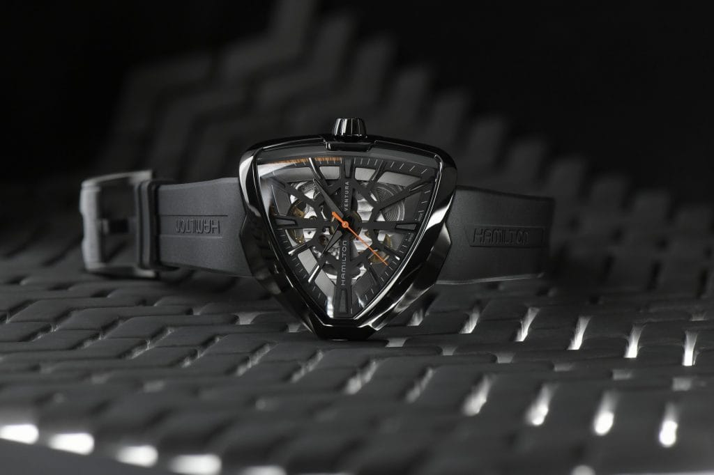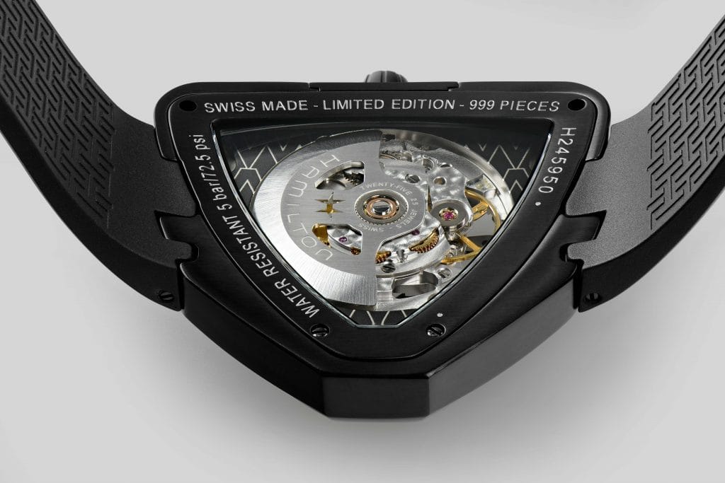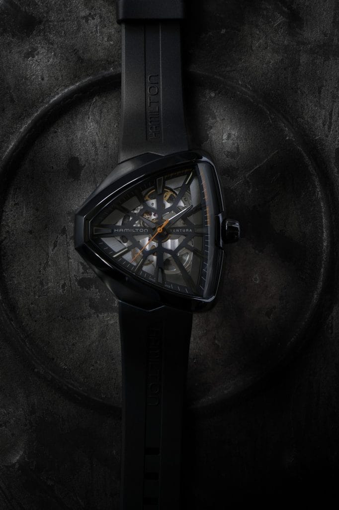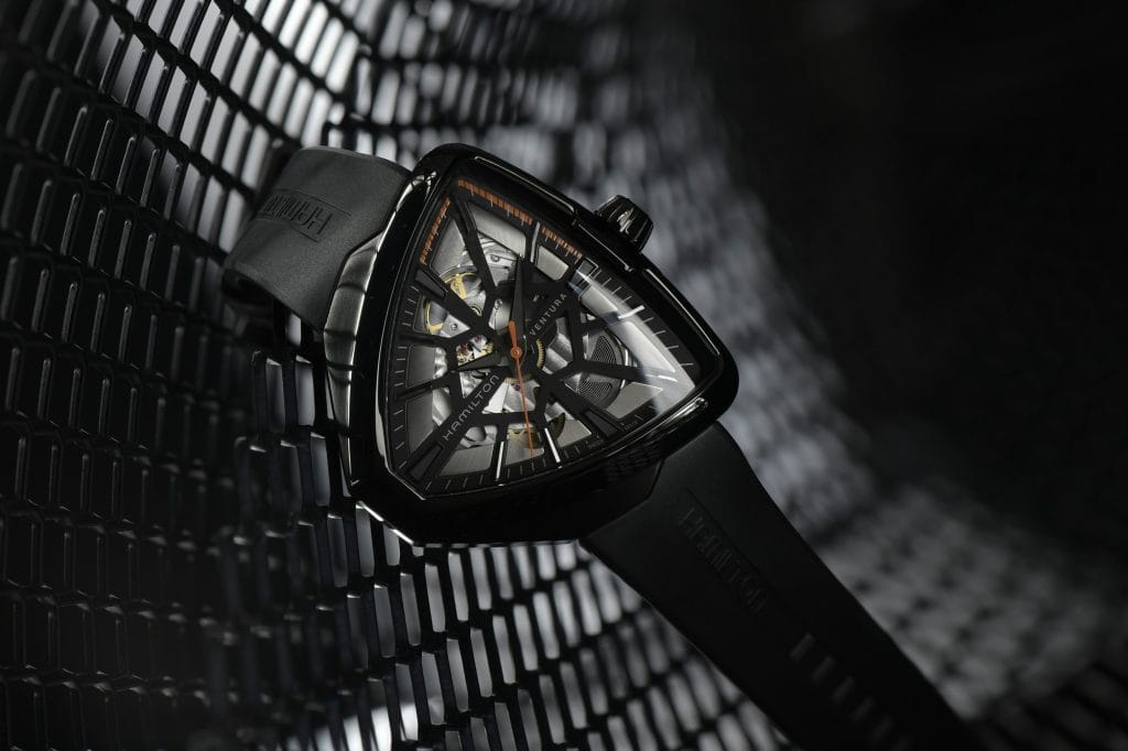 La collection Ventura originale de 1957 a légué à ce modèle son emblématique boîtier asymétrique, modernisé pour l’occasion dans une version squelettée spectaculaire, produite en édition limitée, qui s’est déjà fait remarquer sur grand écran.