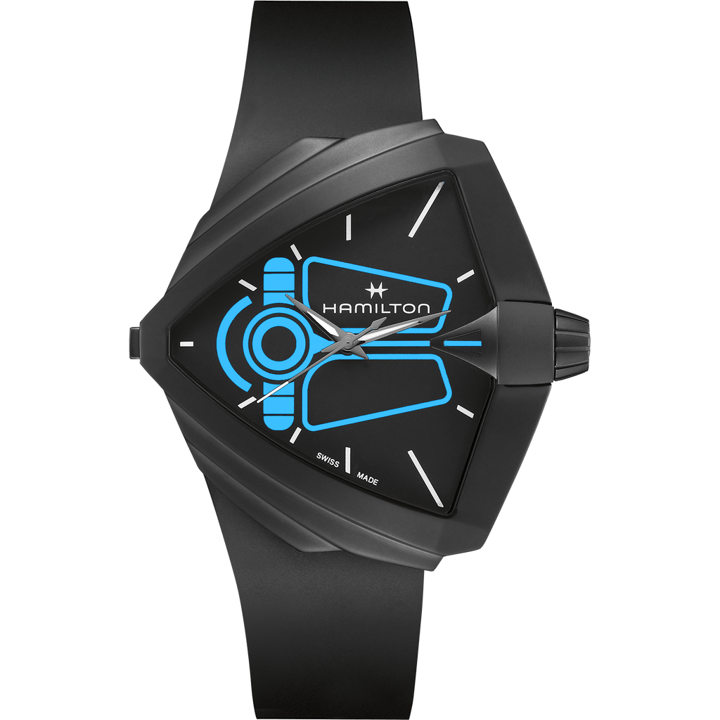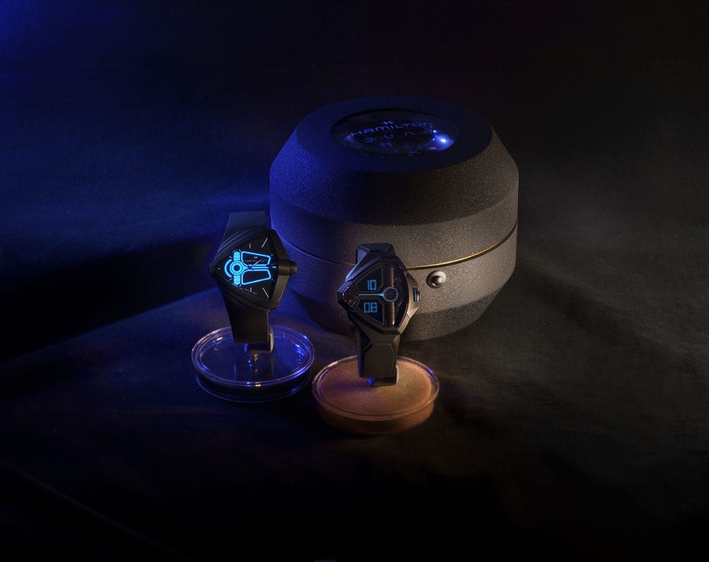 Si la « Desert Watch » est exclusive à Arrakis, elle a néanmoins inspiré Hamilton pour le lancement de deux montres en édition limitée en février 2024, coïncidant avec la sortie en salles de « Dune : Deuxième Partie. » Les deux Ventura sont dotées d’un cadran bleu lumineux rappelant les yeux bleus caractéristiques des Fremen. La Ventura Bright comprend un bouton qui réplique les lignes bleues lumineuses du cadran de la « Desert Watch ». La toute nouvelle Ventura Edge présente un boîtier angulaire doté d’un revêtement PVD noir mat avec affichage numérique bleu répliquant les éléments en relief visibles sur l’accessoire du film.