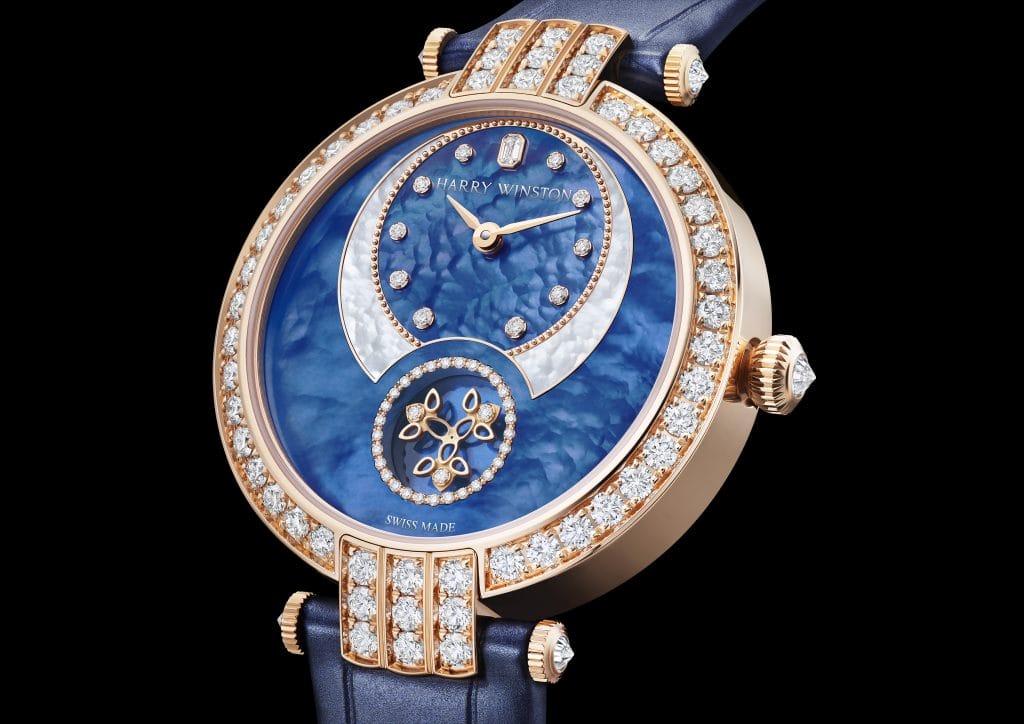 Le subtil compteur de petite seconde rend lui aussi hommage au riche héritage de la Maison Harry Winston, évoquant l’emblématique motif Cluster, un design révolutionnaire développé par M. Winston, qui souhaitait libérer les diamants de leur carcan métallique. Alternant diamants taille poire, marquise et brillant disposés selon des angles différents, ces grappes de pierres précieuses se muent en sculptures tridimensionnelles foisonnantes de vie et de mouvement.
