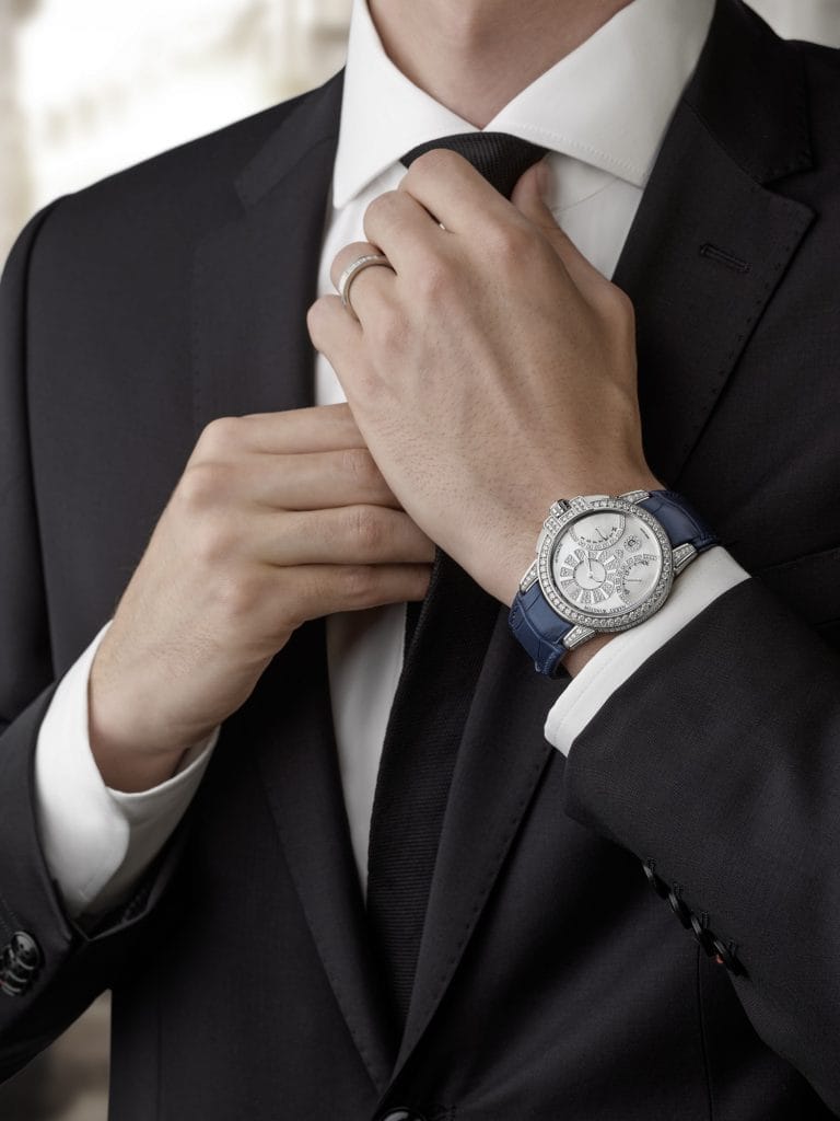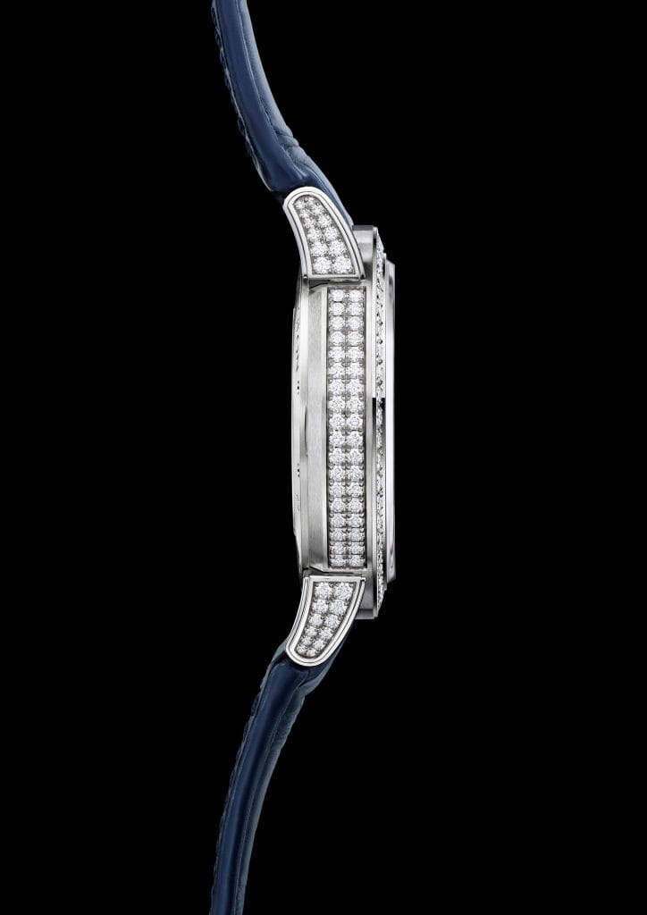 Pour créer une impression de profondeur et de volume, les compteurs principaux sont légèrement surélevés par rapport au triangle serti de diamants qui oriente le regard vers le guichet de date circulaire. Aussi belles que fonctionnelles, les aiguilles sont revêtues d’une substance luminescente qui brille dans le noir tandis que le guichet de date, lui, est surmonté d’une loupe. Le garde-temps est étanche jusqu’à 100 mètres de profondeur.