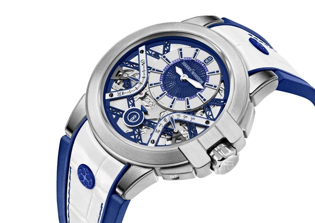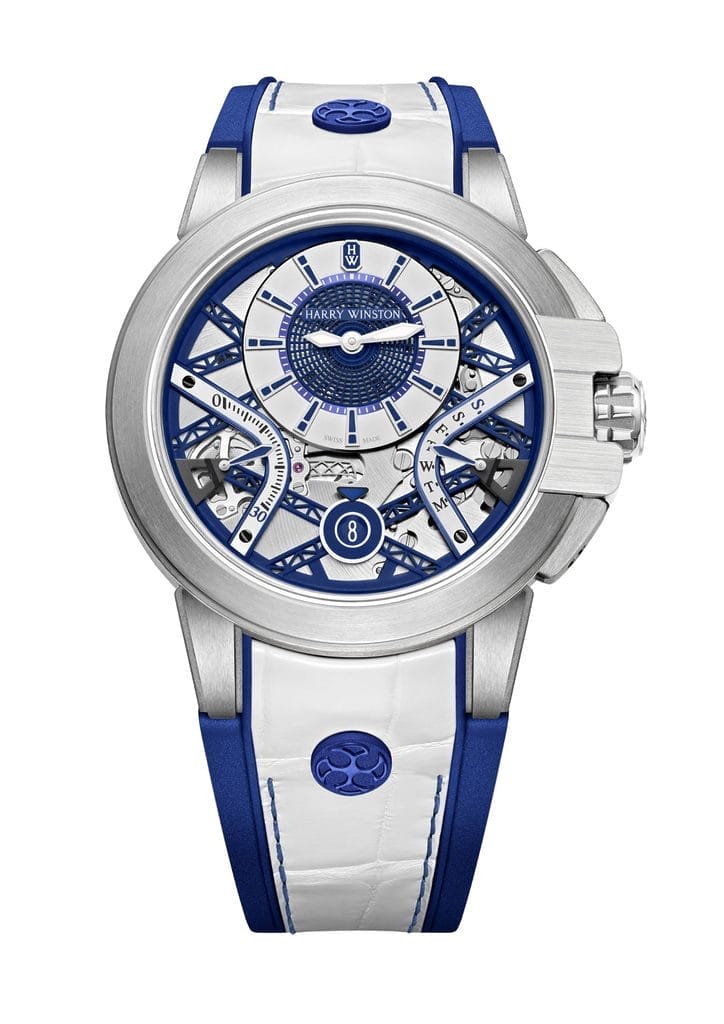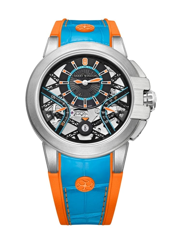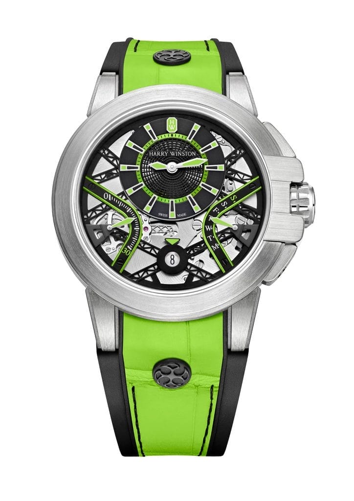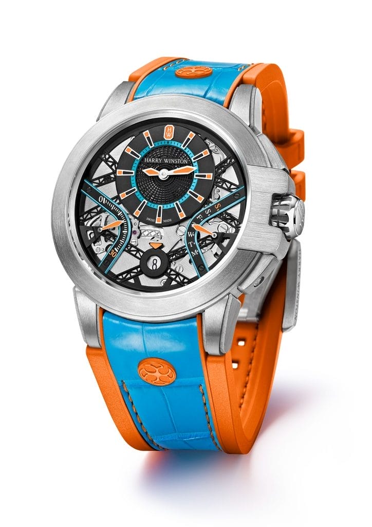 Les créations de la collection Ocean se distinguent par des heures et des minutes excentrées ainsi que par des affichages rétrogrades. Les cadrans excentrés des nouveaux modèles présentent une combinaison bicolore dynamique de couleurs vives. Il existe une variante turquoise avec des accents orange vif, une version vert fluo avec des contrastes noir mat et un modèle blanc éclatant avec des touches bleu marine. En harmonie avec la finition sportive de la montre, les index appliqués, les aiguilles des heures et des minutes et même l’applique Emeraude Harry Winston en or 18 carats à 12 heures sont luminescents.