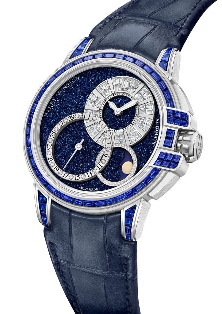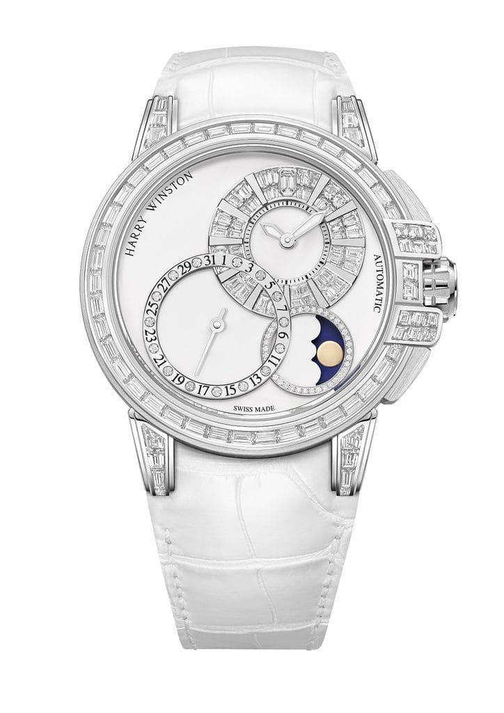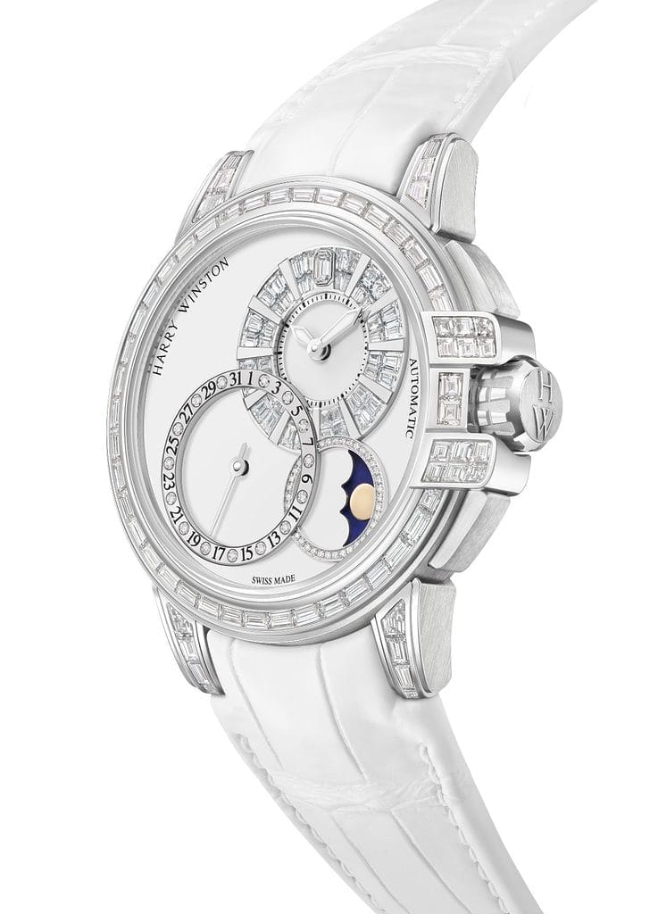 Quittant son poste d’amarrage traditionnel dans l’hémisphère nord du cadran, le compteur des heures et des minutes a mis le cap plus à l’est pour jeter l’ancre à 2 heures. Les index des heures en or poli sont flanqués de diamants taille baguette pour mieux les sublimer, tandis que le diamant taille émeraude emblématique de Harry Winston orne majestueusement le cadran à midi.