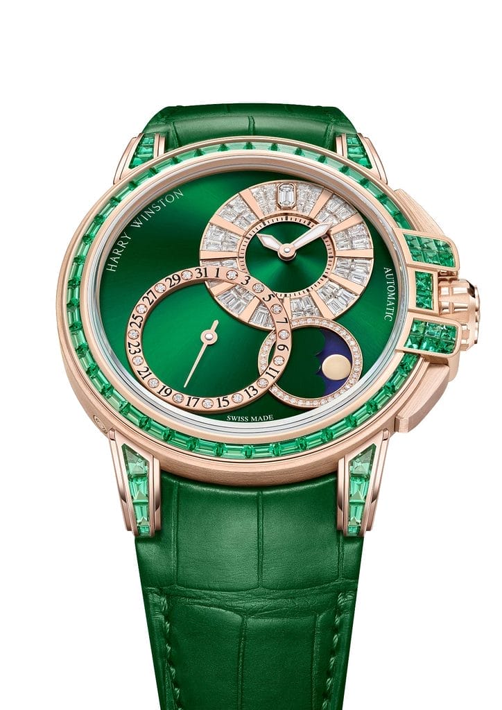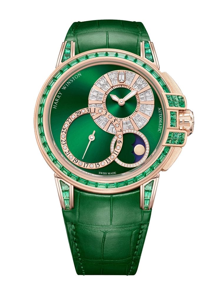 Visible à travers le fond en verre saphir, le mouvement est magnifiquement décoré de Côtes de Genève circulaires, d’un rhodiage et d’un perlage circulaire. Pour une stabilité, une performance et une précision qui résistent à l’épreuve du temps, le spiral est en silicium, un matériau innovant, insensible aux fluctuations magnétiques et thermiques. Dans une dernière envolée évoquant l’opulence caractéristique de Harry Winston, le rotor en or blanc 18 carats du modèle laqué blanc scintille de l’éclat de 26 diamants taille baguette ; le rotor du cadran orné de cristaux de ruthénium bleus est serti de 26 saphirs taille baguette ; et le rotor en or rose 18 carats de la version verte arbore 26 émeraudes taille baguette.