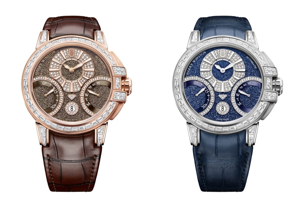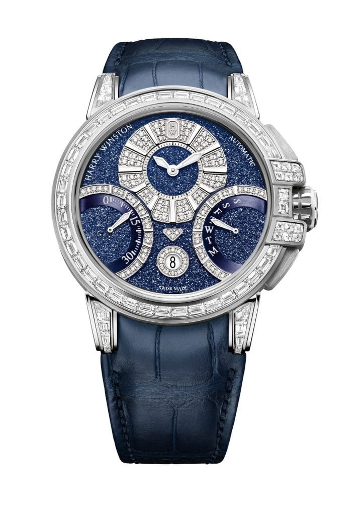 Toujours à l’affût de nouvelles techniques et de nouveaux matériaux qui égayeront les cadrans, les designers Harry Winston ont été frappés par la personnalité étincelante des cristaux de ruthénium, une forme cristalline du ruthénium. À l’instar du soleil heurtant l’océan, les cristaux de ruthénium captent la lumière de manière inattendue. Derrière leur éclat séduisant, leur texture sableuse et légèrement granuleuse ajoute un intérêt visuel et de la profondeur au cadran. Les cristaux et les 127 diamants taille brillant sertis sur le cadran, apportent couleur et lumière à cette création spectaculaire.